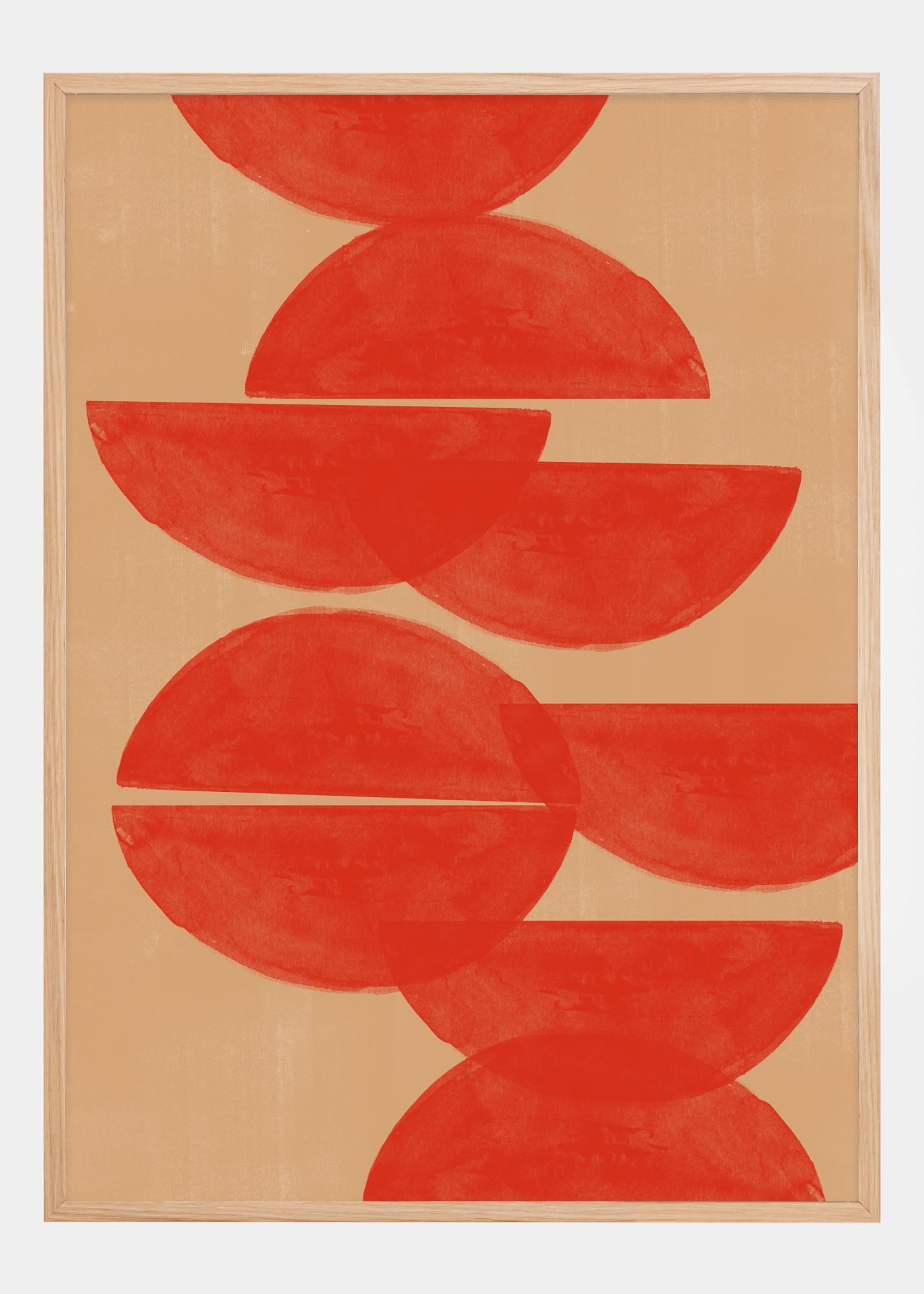 Táto živá a fascinujúca poster robí odvážne vyjadrenie so svojimi prekrývajúcimi sa polkruhmi v hlbokej, č erveno-oranžovej palete. Motív, ktorý je geometrický svojou povahou, opakuje polkruhy v takmer rytmickej organizácii, vytvárajúc pocit pohybu a dynamiky na upokojujúcom béžovom pozadí. Je to tlač, ktorá ponúka súčasný dotyk a energické zameranie do každej miestnosti, v ktorej sa nachádza.