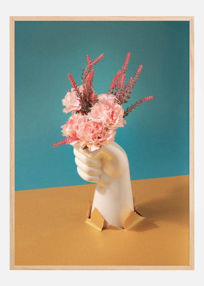 Tento kreatívny a vynaliezavý plagát zobrazuje sochársku ruku, ktorá drží kyticu kvitnúcich kvetov, čím vytvára ilúziu vázy. Pozadie v pokojnom modrom odtieni krásne kontrastuje s teplými žltými a ružovými farbami, čo vytvára svieži a súčasný pocit. Rozdelená kompozícia s rukou, ktorá preruší žltú plochu, dodáva obrazu prvok dynamiky a trojrozmernej ilúzie.
