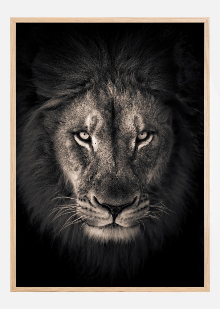 Tento silný a pútavý plagát zachytáva hlboký pohľad leva, čo vytvára pocit jeho sily a prítomnosti. Čiernobiele tónovanie dodáva obrazu nadčasovú kvalitu a zvýrazňuje majestátne črty leva a intenzitu, ktorá je v jeho očiach. Je to tlač, ktorá vyžaruje autoritu a divokosť, ideálna reprezentácia 'kráľa džungle'.