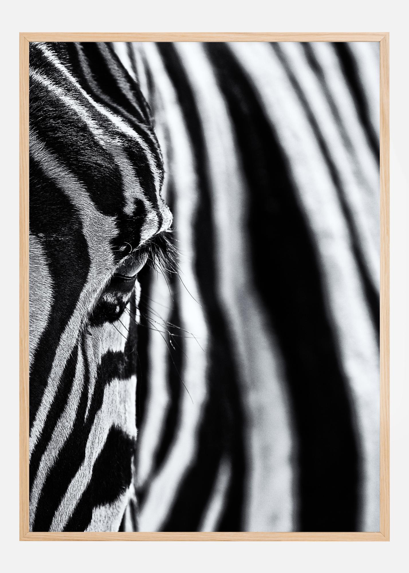 Detailný pohľad na bok tváre zebry. Hrubé čierne a biele pruhy vytvárajú úžasné geometrické tvary, ktoré pohybujú pohľadom. Zebrie oko a jeho mihalnice robia obraz jemnejším. Zaveste to na bielu stenu, aby sa zachoval silný čiernobiely efekt.