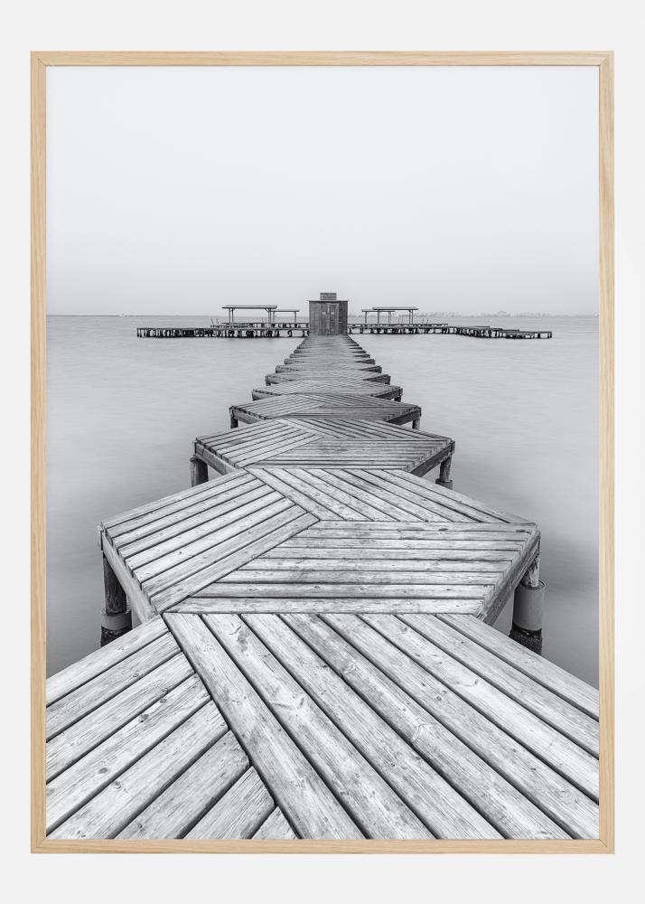 Zábavný plagát so šesťhranným mólom, ktorý postupuje smerom k diaľave nad pokojným jazerom. Obrázok je v tlmených odtieňoch sivej, čo spôsobuje, že vyzerá skôr chladne ako teplo. Drevené mólo vás zavedie do diaľky, kde na vás čaká prístavisko. Skombinujte s jasnou farbou, aby ste pridali teplo.
