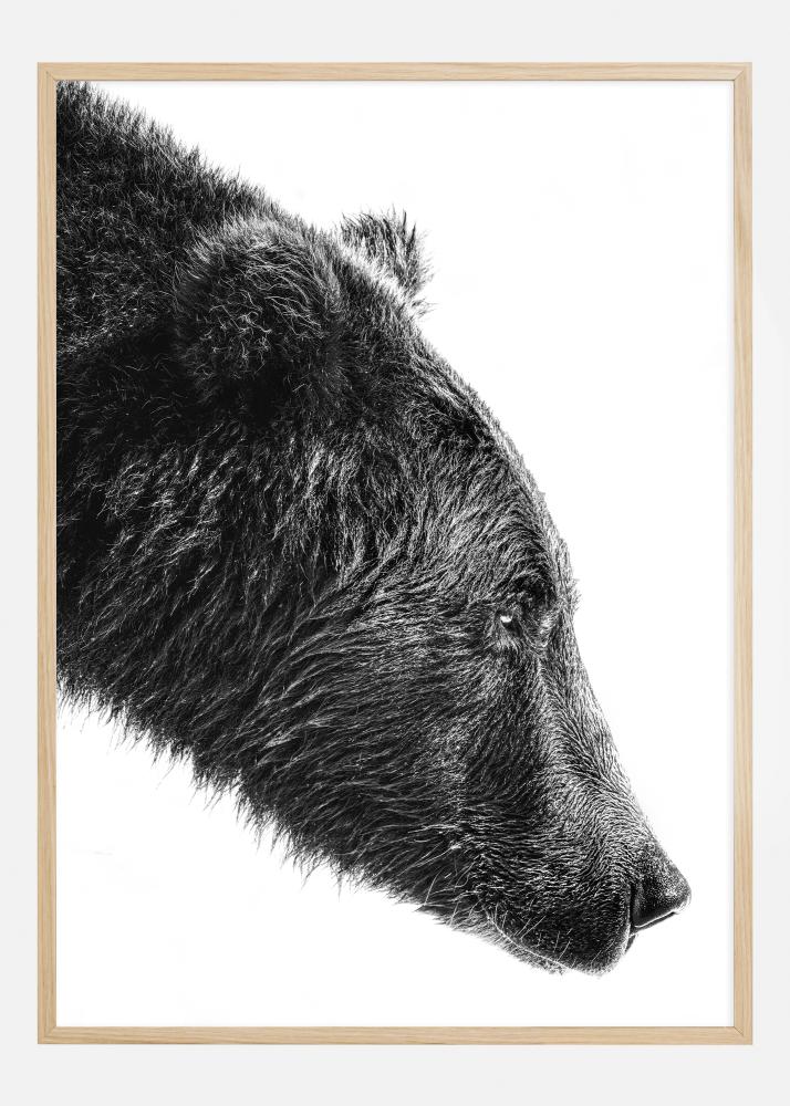 Tento štýlový a silný print predstavuje detailný záber medveďa v čiernobielom prevedení, motív, ktorý prináša surový a úprimný pocit z nespútaného ducha prírody. Obrázok sa zameriava na profil medveďa, kde sú vďaka kontrastu medzi tmavými a svetlými tónmi zdôraznené všetky detaily srsti a pokojné oči.