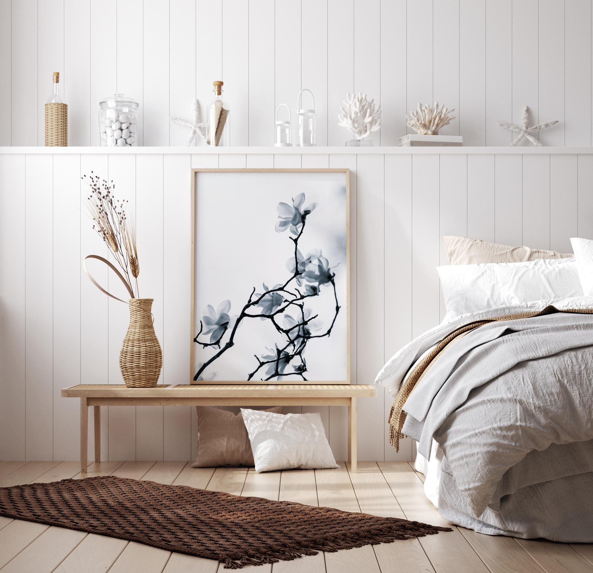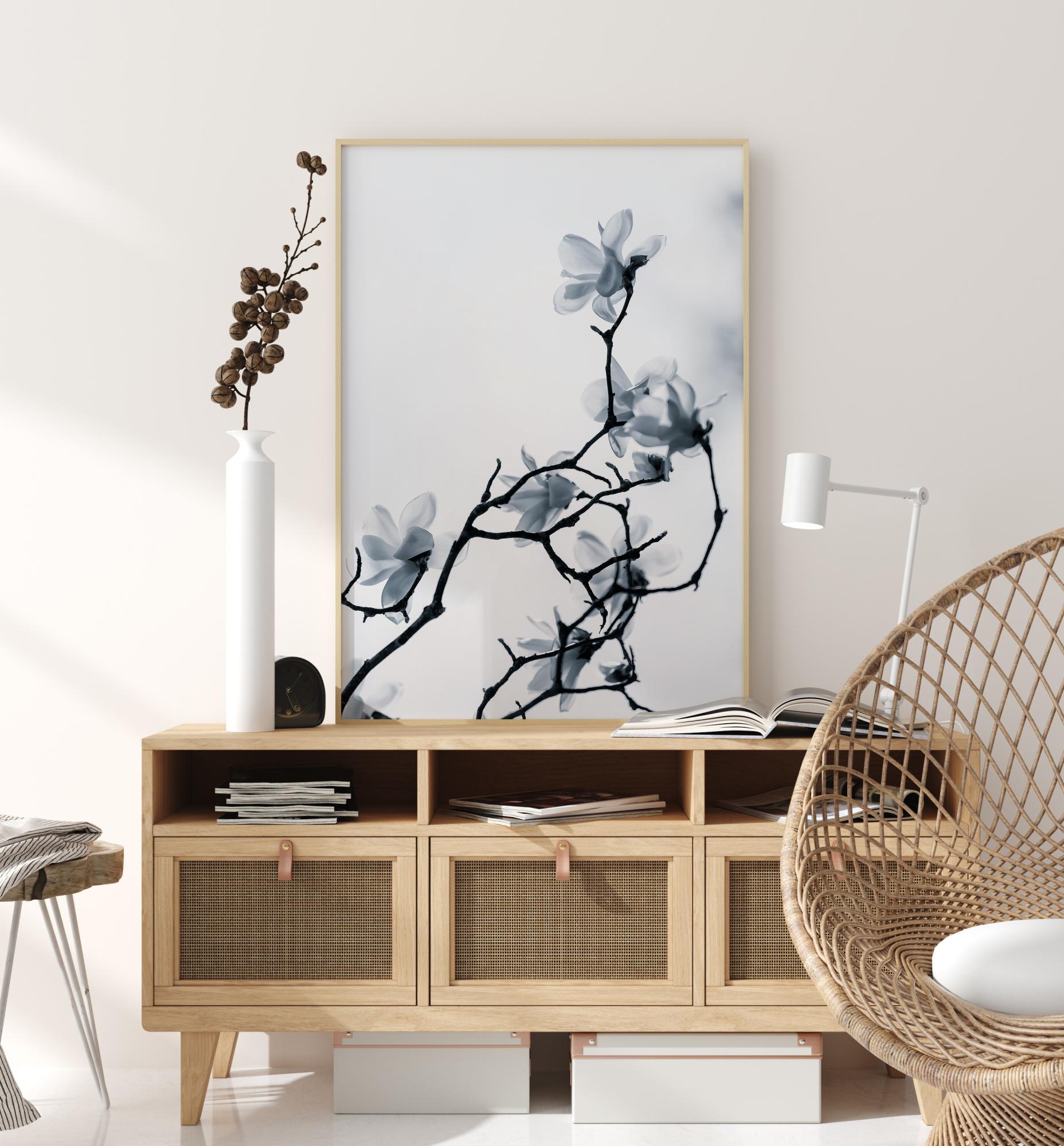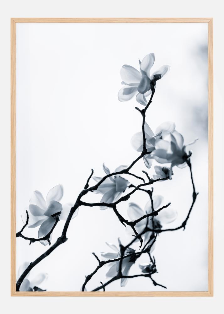 Kvetinový plagát s elegantnou vetvičkou plnou jemných kvetov. Tenké vetvičky sú čierne proti bielej oblohe a smerujú nahor, pričom každá nesie jemný biely kvet. Pokoj a mier vyžarujú z tohto obrazu, ktorý by sa dobre hodil ako doplnok do kúpeľne alebo na jednoduchú chodbu.