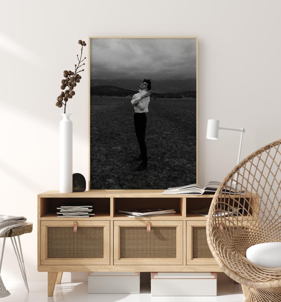 Portrétový plagát bezstarostného muža uprostred otvoreného poľa. Jemné čierne a biele tóny dodávajú prirodzený pocit. Užite si tento súkromný okamih zachytený navždy, keď si ho zavesíte doma.