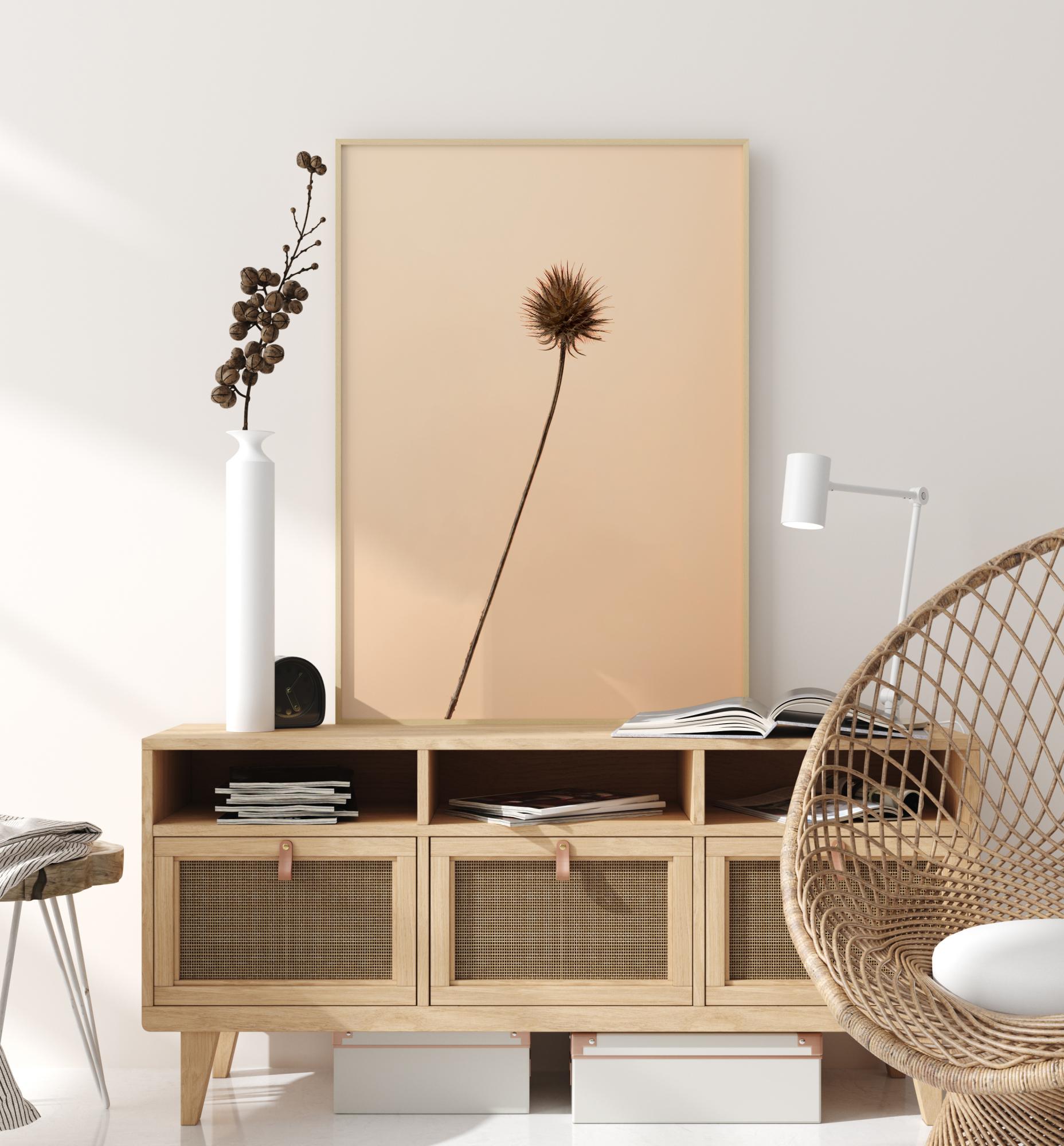 Jednoduchý kvetinový plagát so samostatne stojacim bodliakom proti bledému nebu. Stoj vysoký, pyšný a osamotený, prines si tento výtlačok domov a každý deň si pripomínaj, že môžeš dosiahnuť všetko, čo chceš.