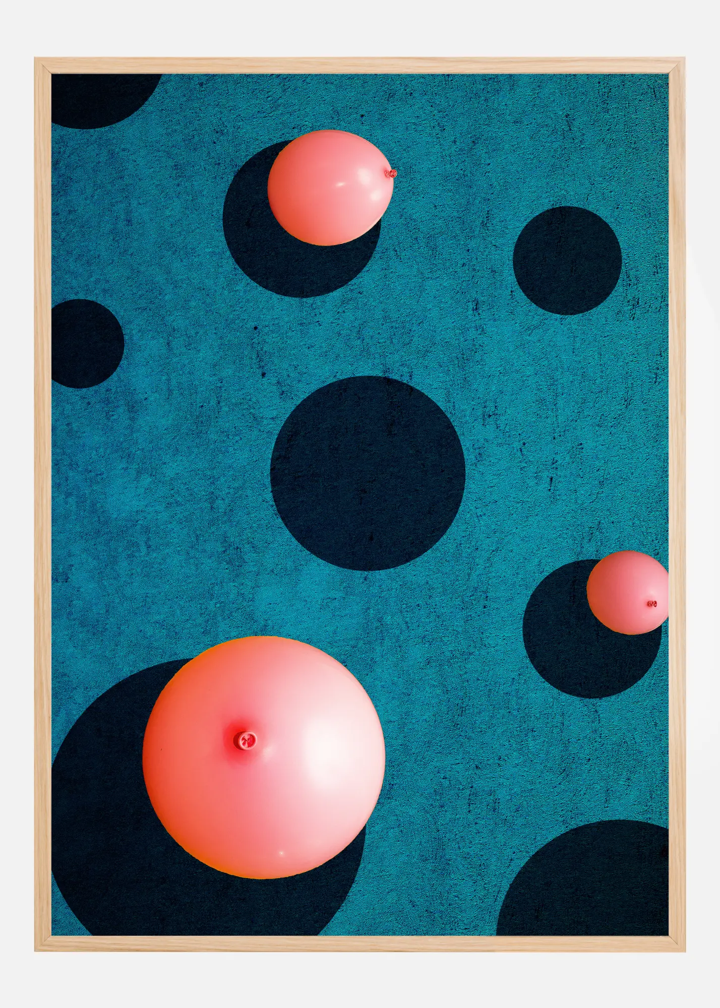 Živý plagát s tromi oranžovými balónmi na modrom pozadí. Každý balón vrhá tmavý tieň na pozadie. Ale existuje aj viac tmavomodrých tieňových kruhov. Ostatné balóny musia plávať niekde vyššie v tomto zvláštnom, ale fascinujúcom plagáte s bodkami.