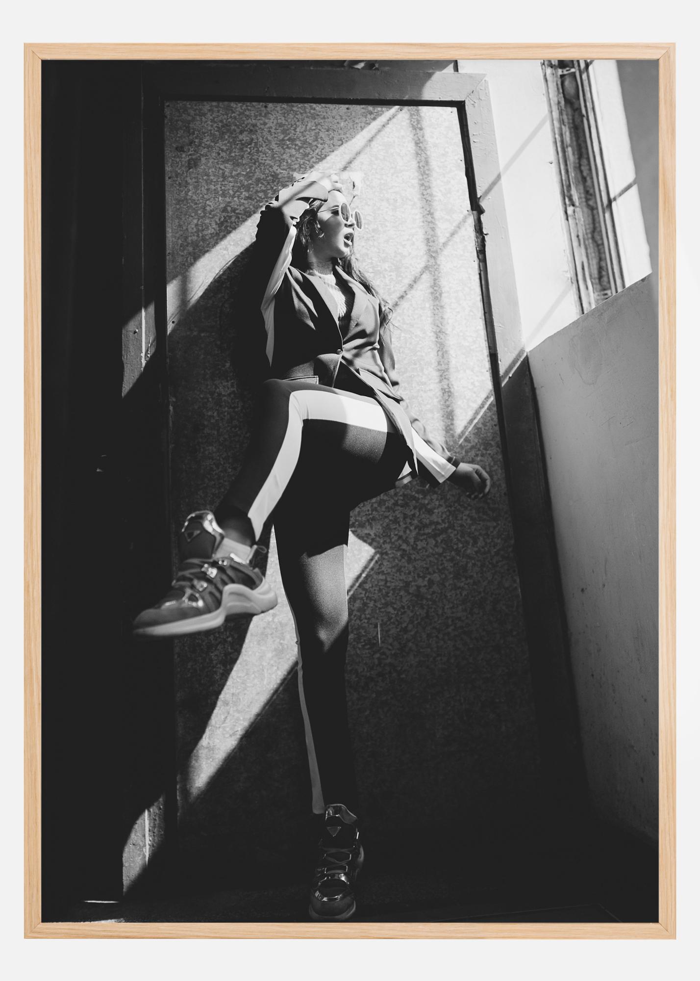 Štýlové fotografické umenie v čiernobielej farbe. Plagát, ktorý svojím výrazom sprostredkúva krásnu zmes prísneho a módneho v kontraste s uvoľneným a hravým. Skombinujte ho s ďalšími obľúbenými kúskami na väčšej stene s obrazmi.