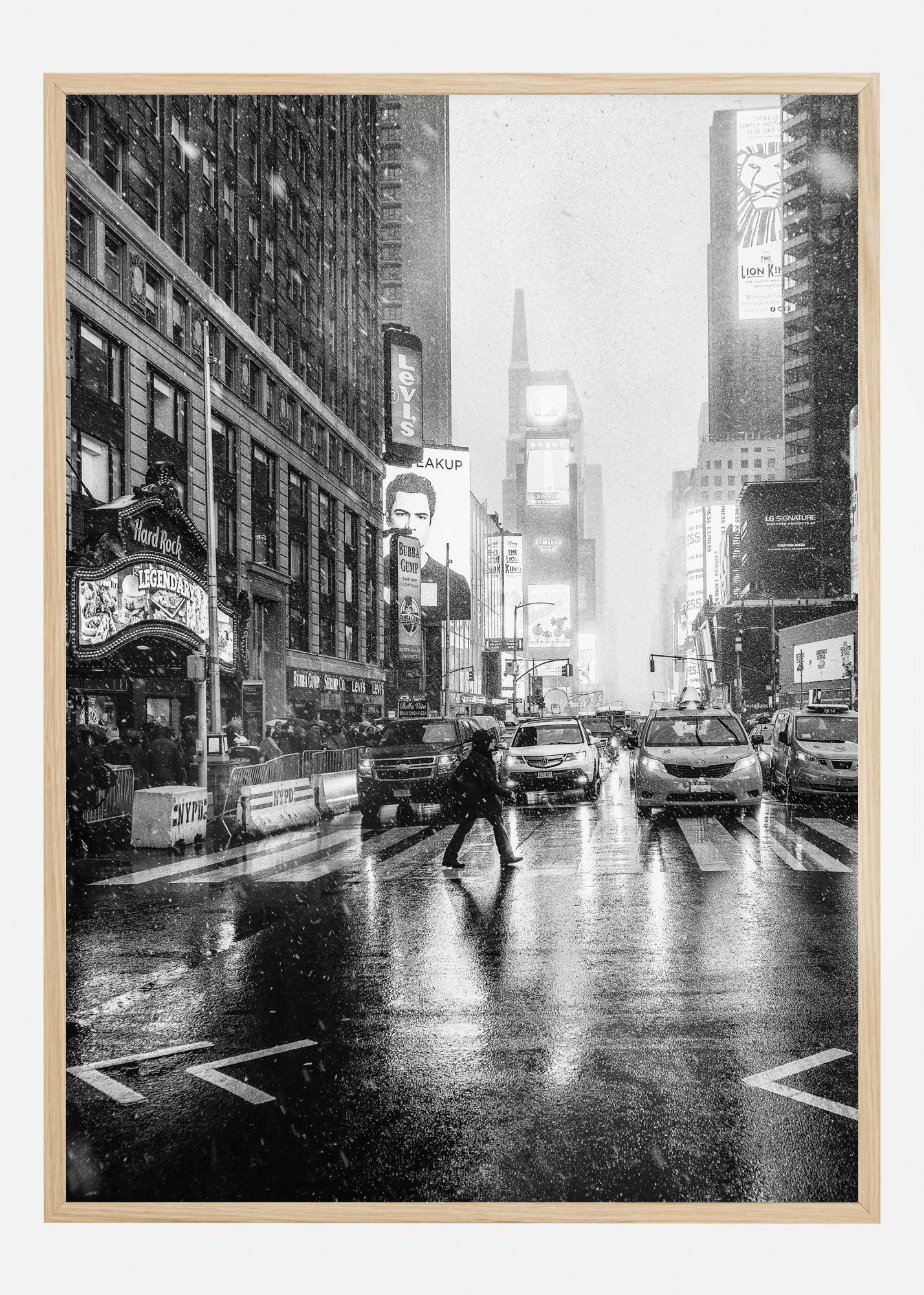 Mestská plagát s Times Square v New Yorku. Na tejto čiernobielej fotografii prechádza človek ulicou v noci v daždi. Autá čakajú na pokračovanie v jazde. Svetlé reklamné tabule a mrakodrapy sú viditeľné v diaľke, keď pozeráte dole ulicou. Atmosféra je výrazná, človek by tam takmer mohol byť sám.