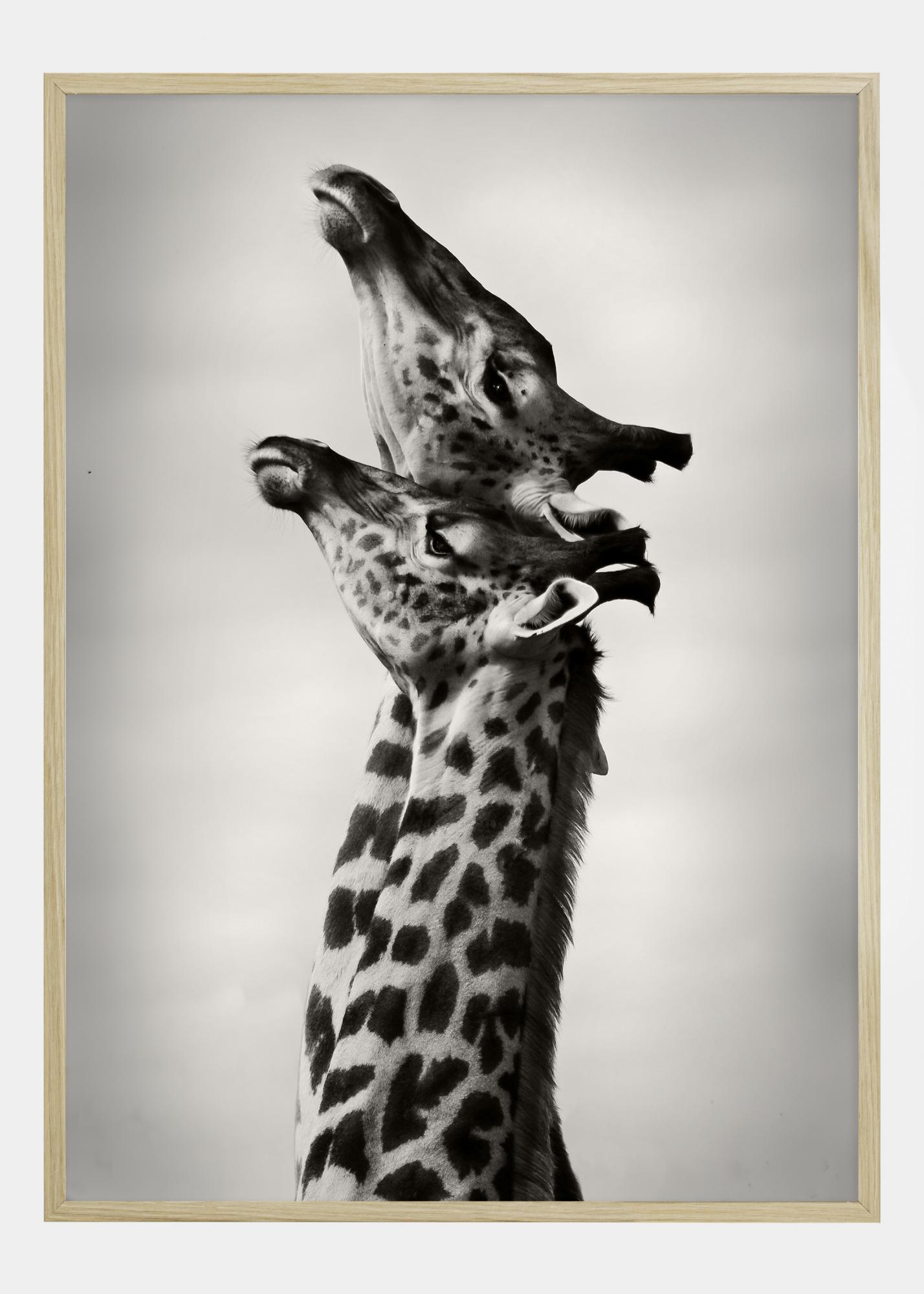 Plagát zobrazuje očarujúci okamih medzi dvoma žirafami, ktoré sa zdajú zdieľať nežnú interakciu, ich krky elegantne ohnuté k sebe. Obrázok je zachytený v čiernobielej farbe, čo zvyšuje ikonické vzory na pokožke žiráf a vytvára silný vizuálny kontrast s mäkkým pozadím oblohy.