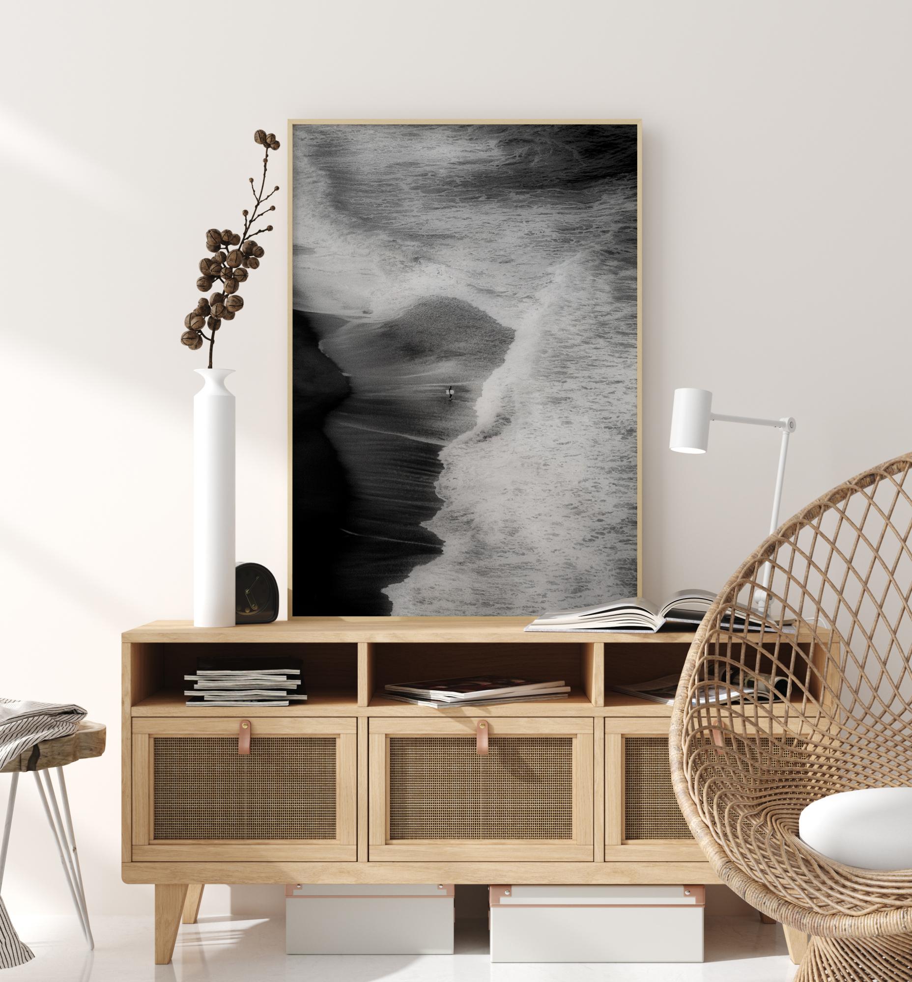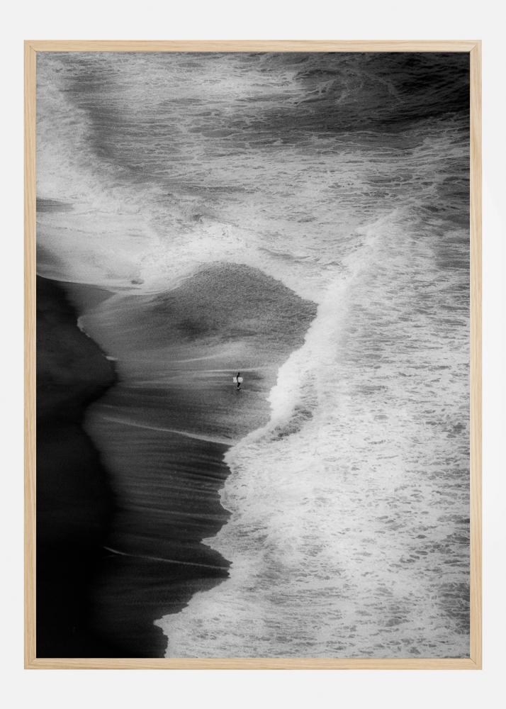 Plagát s plážou a surfovaním z vtáčej perspektívy. Tento abstraktný obraz ukazuje veľkoleposť prírody, keď vlny dosiahnu pláž – osamelý surfista tvorí ústredný bod obrazu.
