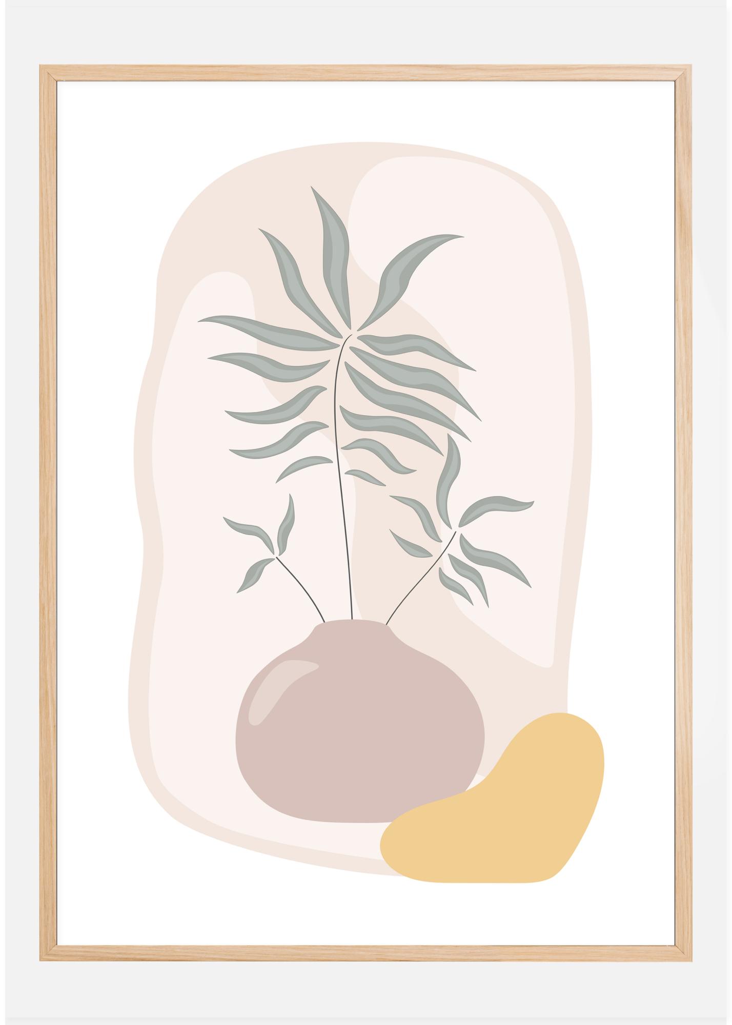 Štylizovaný plagát s vázou so zelenou rastlinou, ktorá z nej vystupuje. Iné zvláštne tvary a farby vyplňujú pozadie a robia z tohto dielo zaujímavé, ale trochu abstraktné. Skombinujte ho s kresbou v podobnom štýle, aby ste si doma vytvorili vlastnú malú galériu.