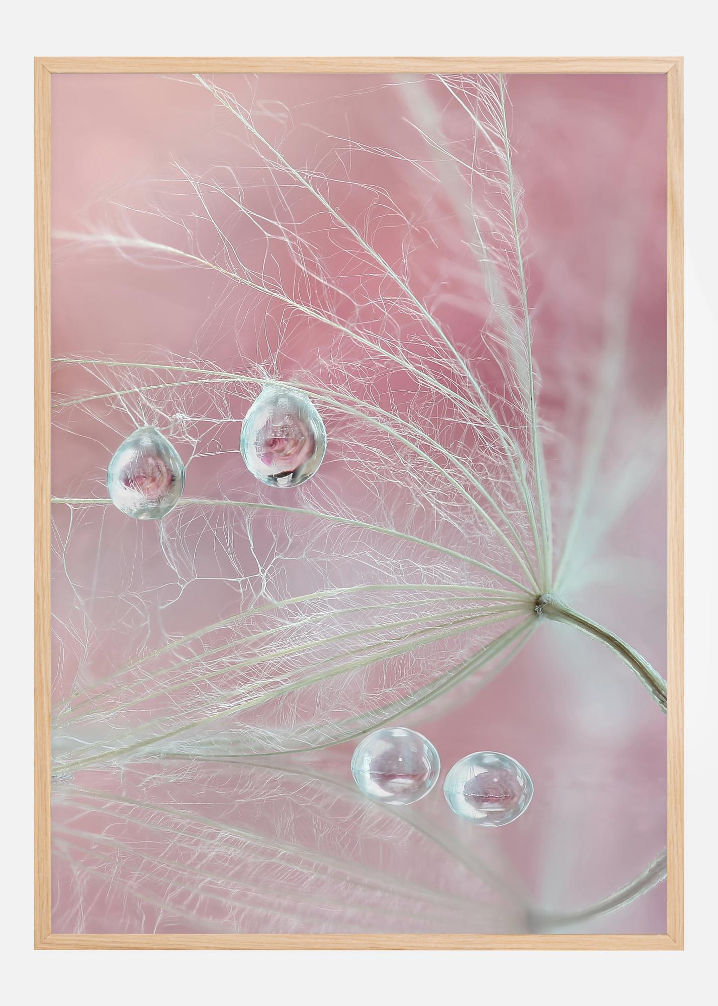 Elegantný plagát s kvetnou hlavou v tvare pavúka, s dvoma kvapkami vody na jemných pierkovitých koncoch. Svetloružové pozadie presvitá cez každú z dokonalých kvapiek vody, keď visia tesne pred tým, než opustia kvet. Užite si jemnú rovnováhu prírody.