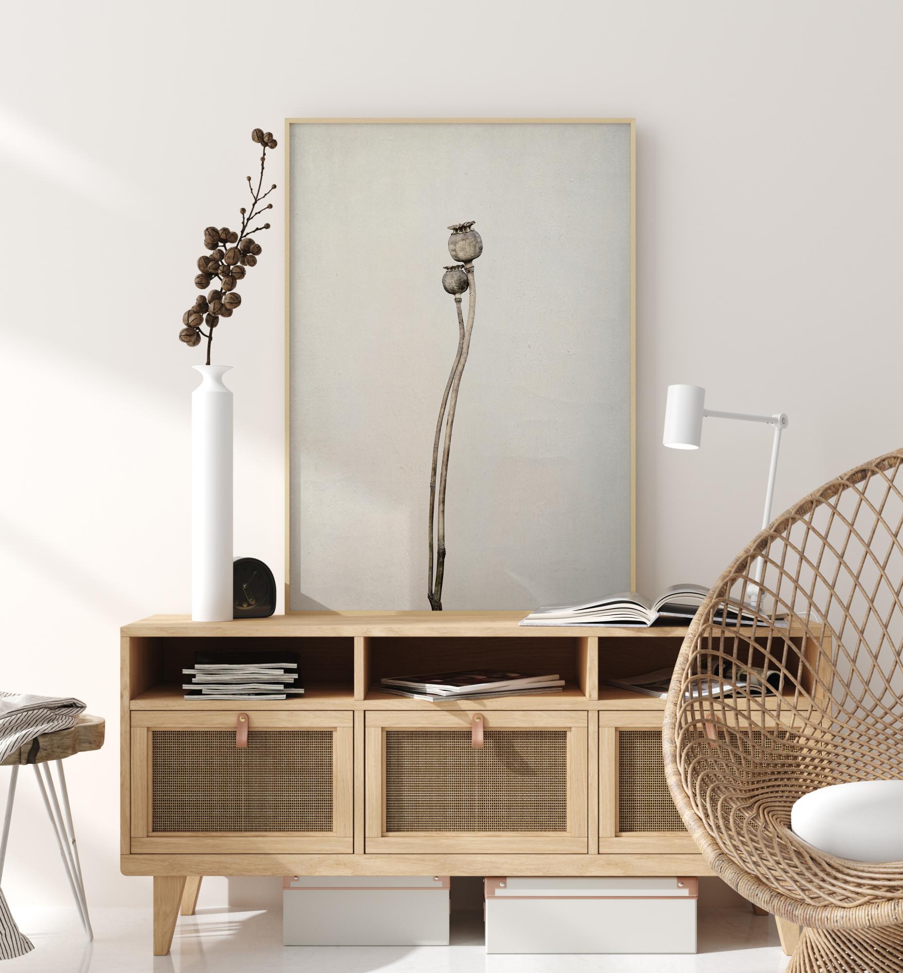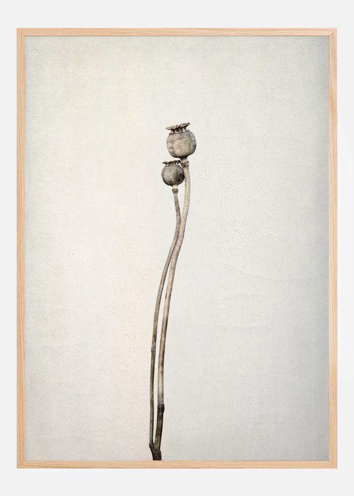 Kvetinový plagát s dvoma makovými strukmi, ktoré sú prepletené v tanci. Čiernobiely obraz má tieto dva dlhé makové semená, ktoré sa krútia na bielom pozadí. Tento elegantný tanec upúta pozornosť, keď sa tieto makové hlavy pripravujú na prasknutie a rozptýlenie svojich semien, aby pestovali nové kvety.