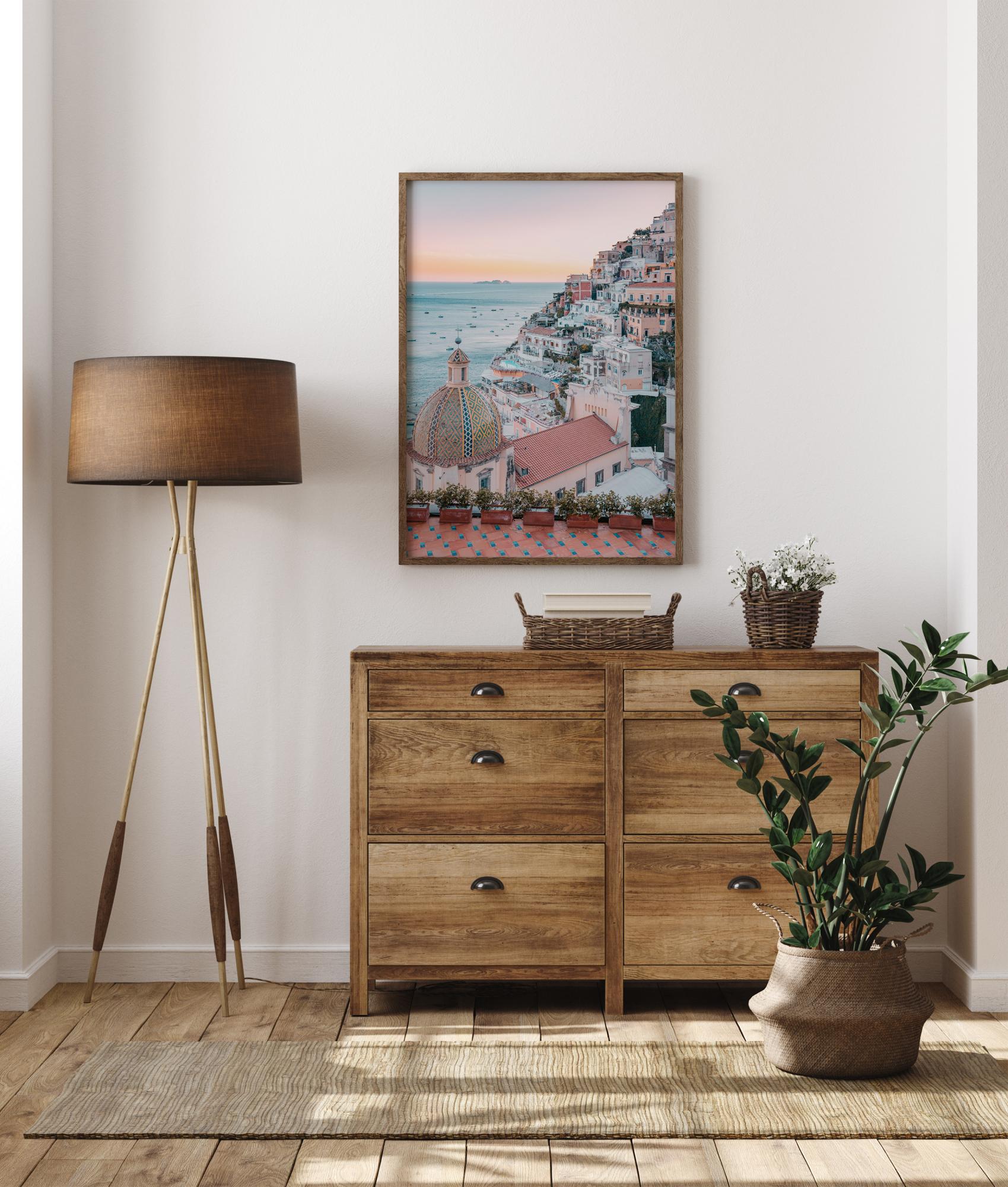 Cestovný plagát s mestom pri mori. Jemné biele a pastelové domčeky vytvárajú dovolenkovú atmosféru v tomto stredomorskom prostredí. Svetlomodré more sa rozprestiera ďaleko a je plné malých rybárskych lodiek. Východ slnka je vidieť priamo na horizonte a vrhá teplé svetlo na obraz.