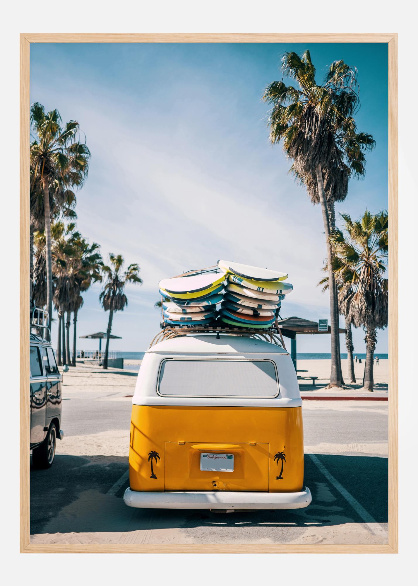 Vtipný dovolenkový plagát so žltým karavanom, ktorý stojí zaparkovaný na parkovisku blízko pláže. Palmy obklopujú parkovisko, aby mu dodali dovolenkovú atmosféru. Jasné slnečné lúče dopadajú na scénu a vytvárajú pocit príjemného teplého letného dňa, ideálneho na rýchle surfovanie na mori na jednom z automobilových surfovacích dosiek.