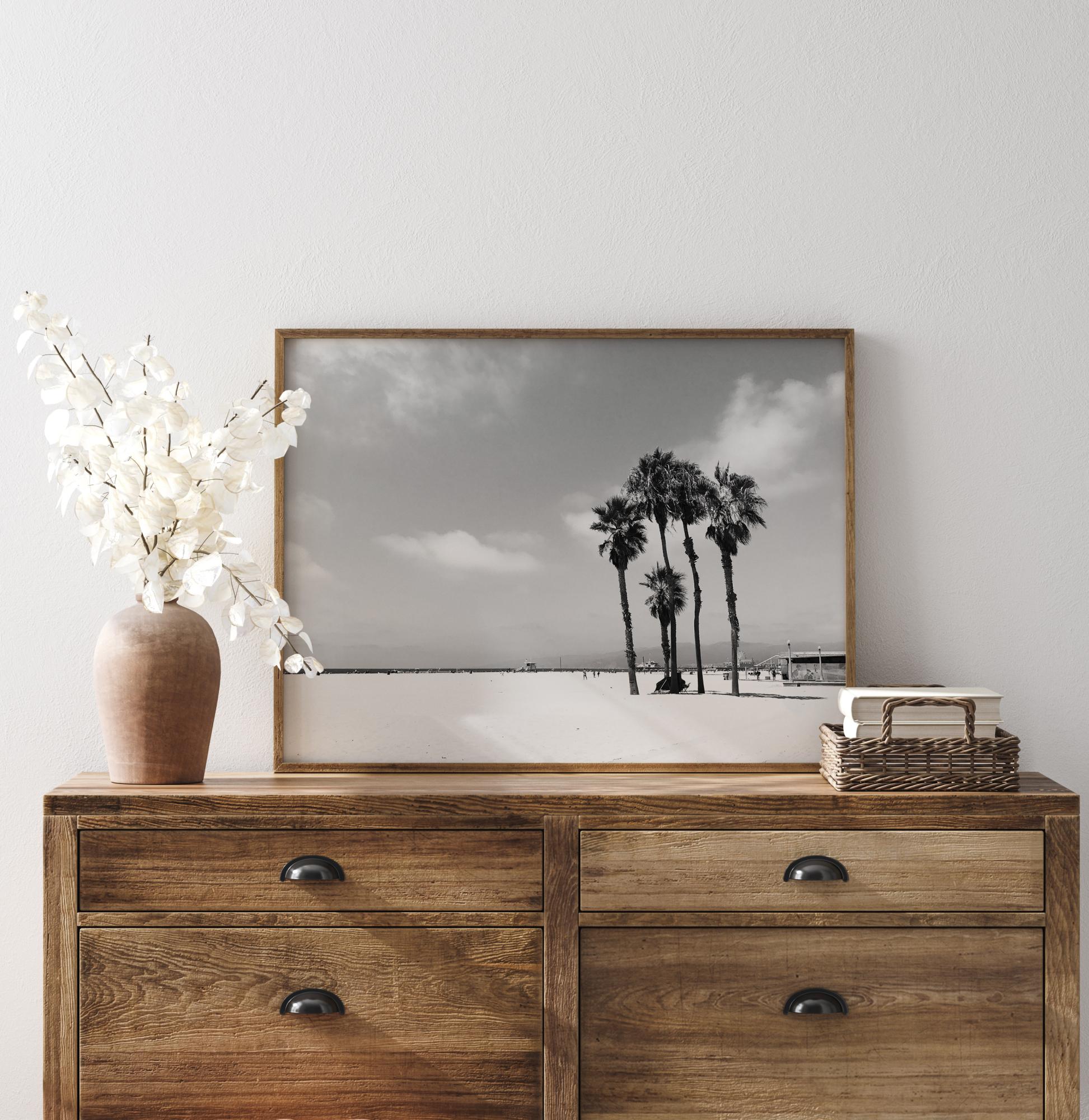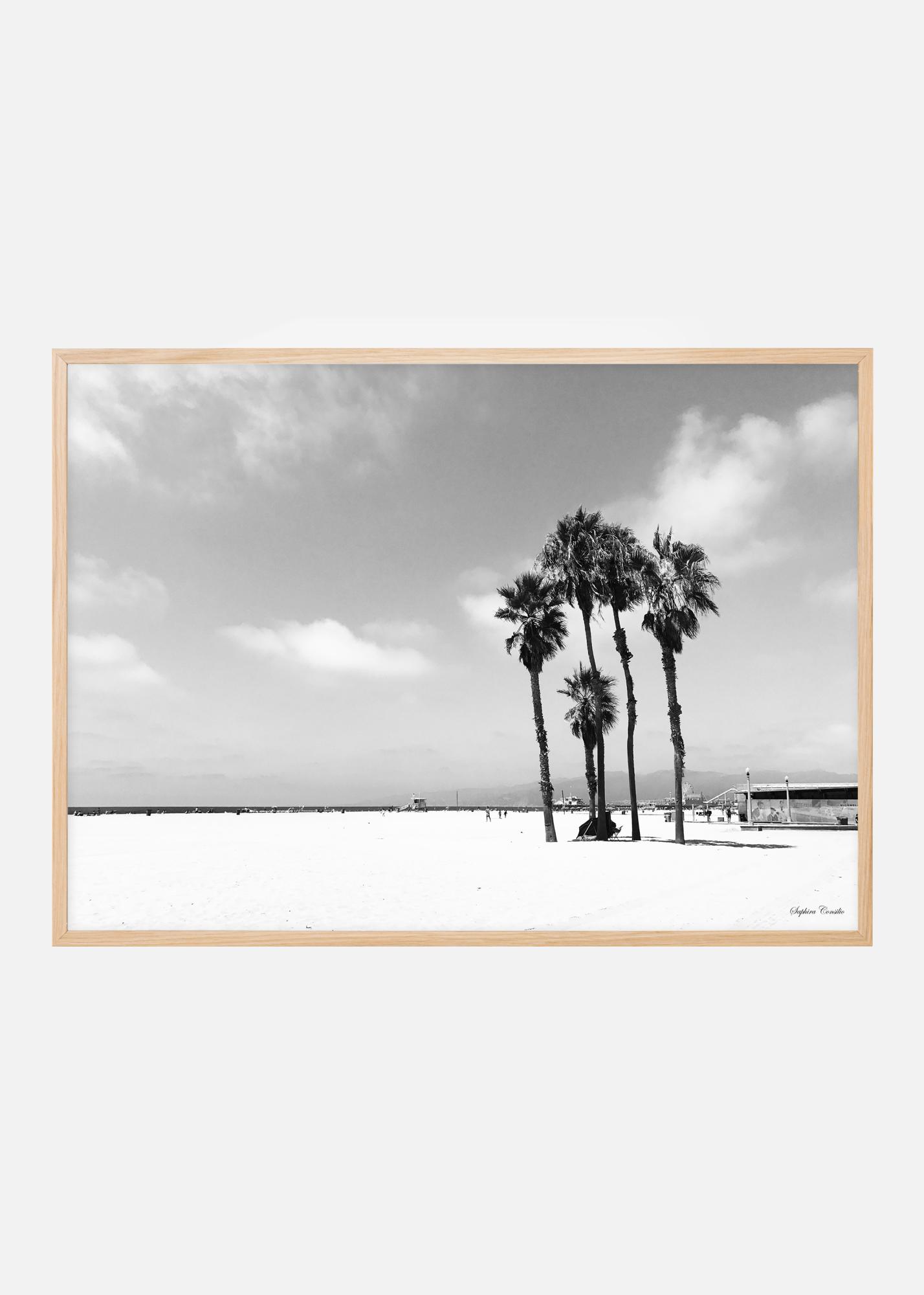 Tu nás fotografka Saphira Consilio vezme na bielu pláž v Benátkach. Tu zdieľajú ľudia miesto s krásnymi palmami, zábavnými parkmi a záchrannými vežami plavčíkov. Pekný čiernobiely plagát v horizontálnom formáte.