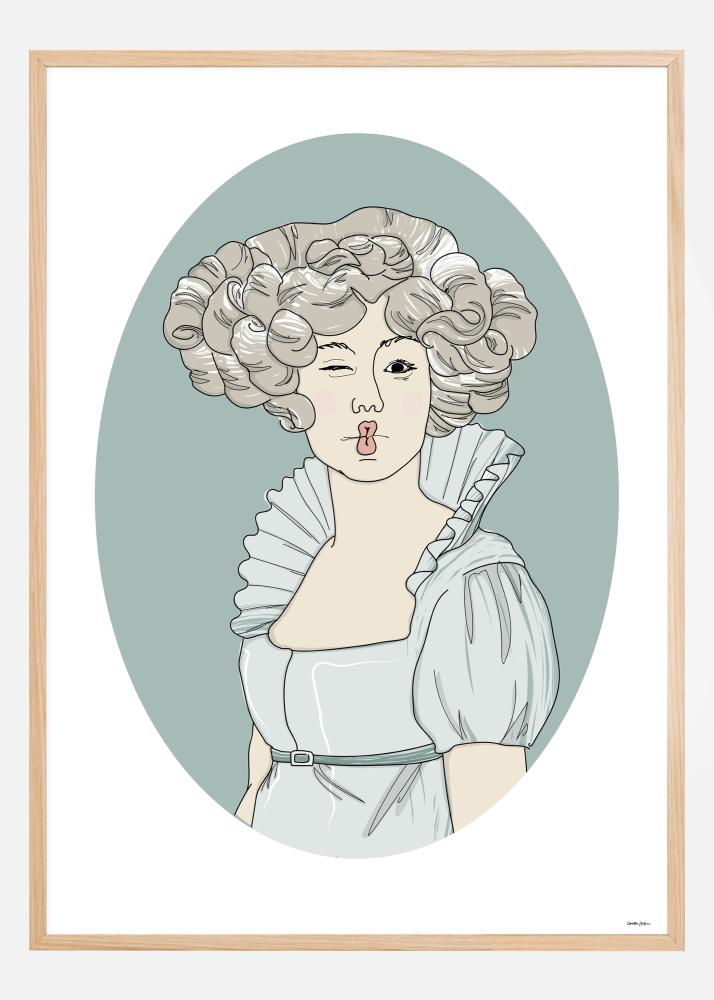 Odvážny plagát s viktoriánskou Violettou, ktorá si nonšalantne žmurká z obrazu s perami našpúlenými do bozku. Jej sivé kučery ladia s jemnými modrosivými šatami s vysokým golierom. Obraz je tiež v modrej oválnej forme, aby napodobňoval staré malé medailónové obrázky a vytvoril jedinečné, zvláštne umelecké dielo.