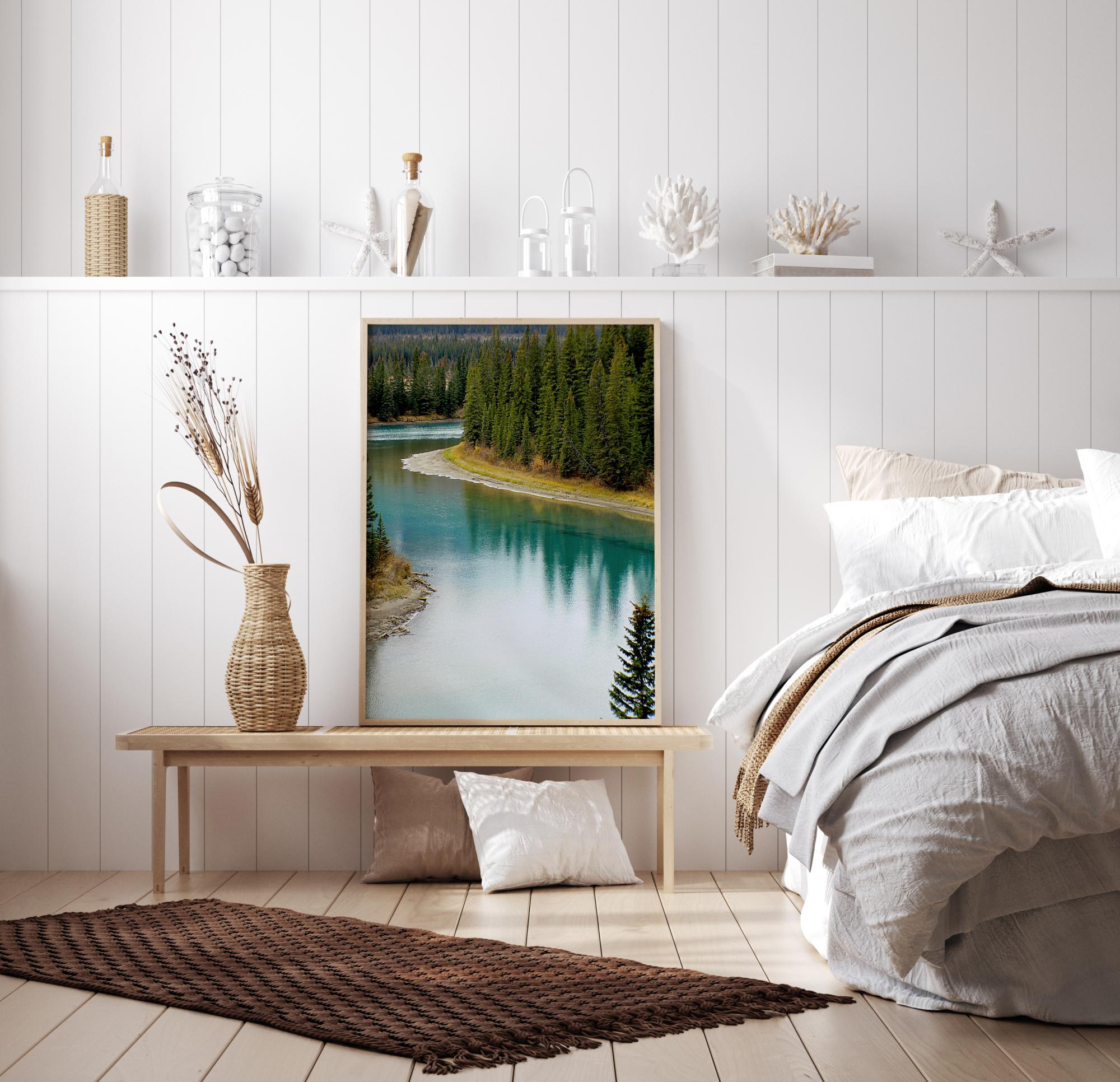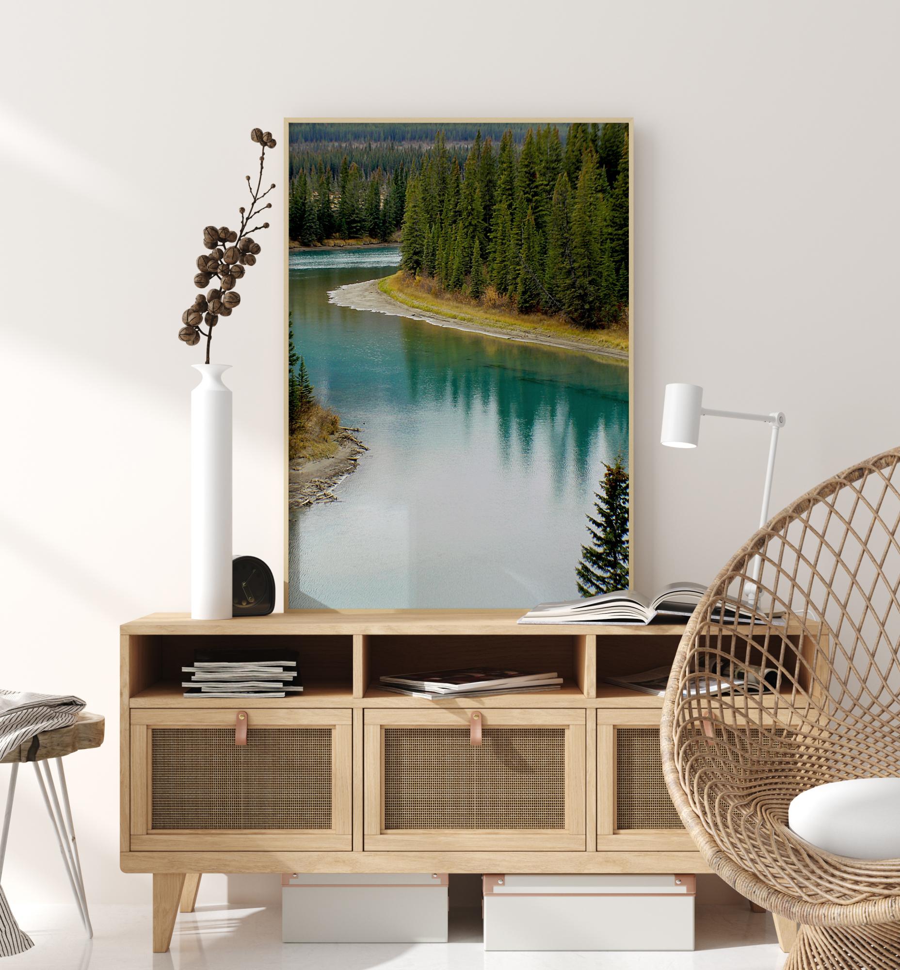 Lesný plagát, kde smreky lemujú breh širokej rieky, ktorá si kľukato razí cestu vidiekom. Zelené stromy stoja vysoké, keď les mizne v diaľke. Široká rieka je takmer dúhovo sfarbená a zachytáva vysoké špicaté odrazy stromov na jej povrchu.