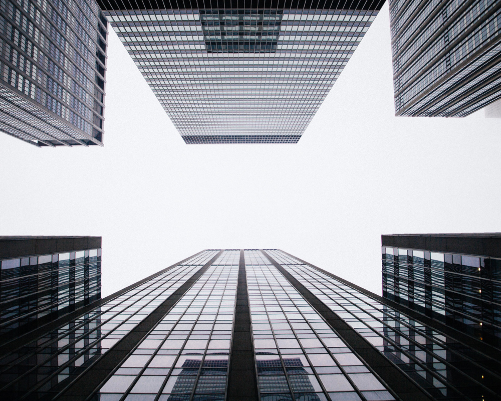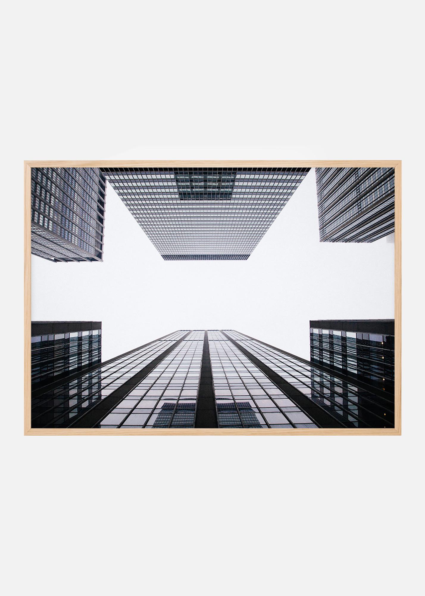 Architektonický plagát s rastúcimi mrakodrapmi proti oblohe vo farbe oblačnej bielej. Elegantný obraz tmavých budov na bielom pozadí s odrazmi oblohy v oknách. Perfektný darček pre toho, kto má rád grafické portréty budov. Plagát vyzerá dobre v čiernom ráme, ktorý zvýrazňuje tmavosť obrazu a pekne sa kombinuje s inými fotografiami architektúry.