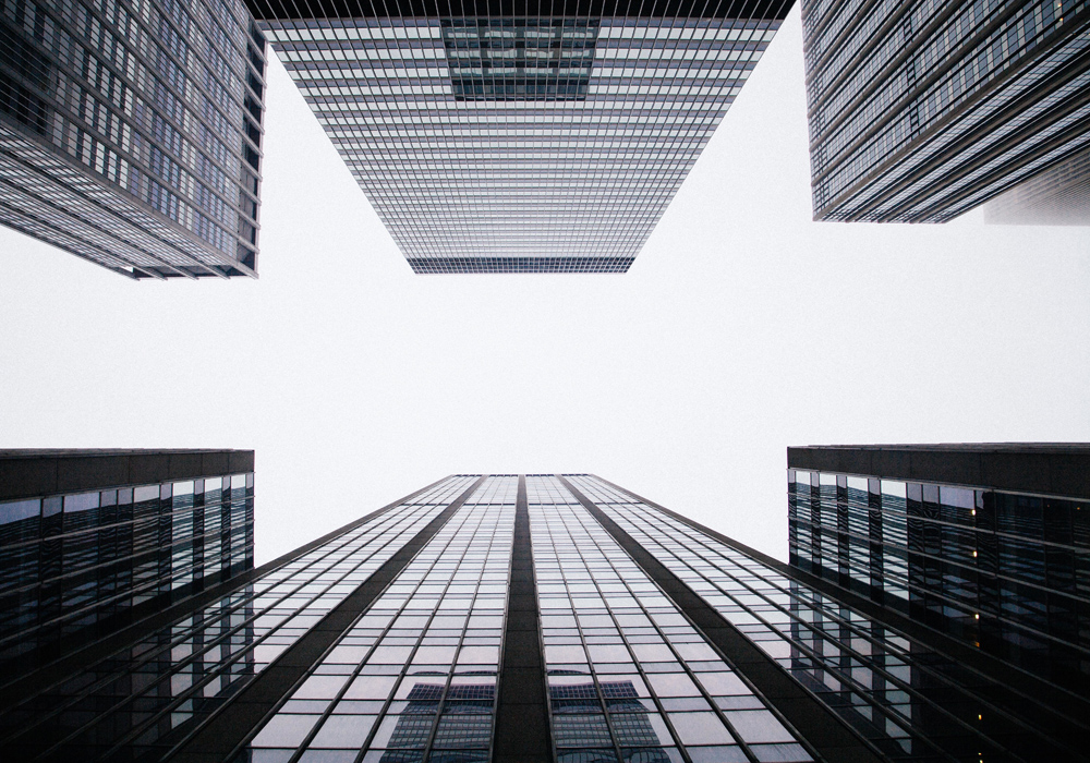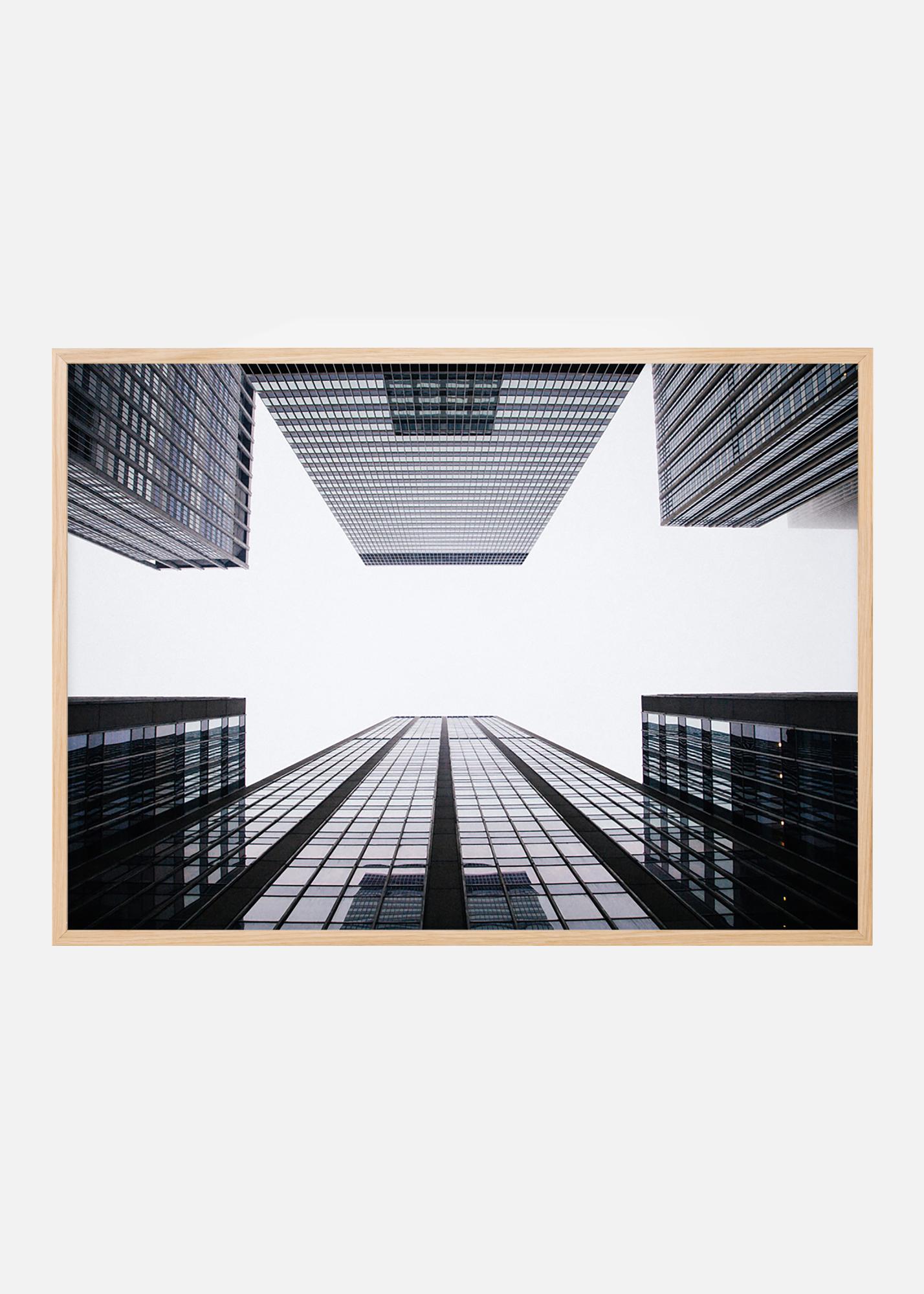 Architektonický plagát s rastúcimi mrakodrapmi proti oblohe bielej ako mrak. Štýlový obrázok tmavých budov na bielom pozadí s odrazmi oblohy v sklenených tabuliach. Perfektný darček pre toho, kto má rád grafické portréty budov. Tlač sa hodí do čierneho rámu, ktorý posilní tmavé časti na obrázku, a bude pekná v kombinácii s inými fotografiami architektúry.