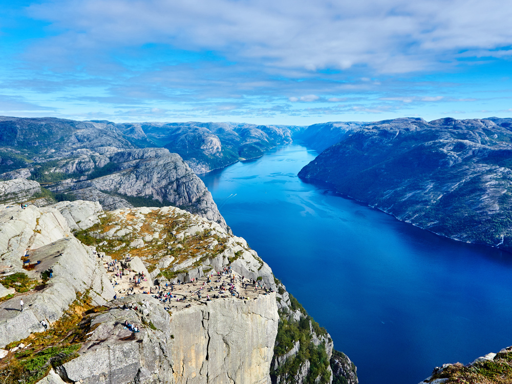 Fotografia s pôsobivým výhľadom na hlboké fjordové údolie. Plagát je v morských modrých odtieňoch so slnečne osvetlenými holými útesmi na oboch stranách fjordu, veľkolepá krajina, ktorá pasuje na stenu pre tých, ktorí ocenia krásne prírodné prostredie. Skombinujte obrázok s rámom na obrazy, ktorý zvýrazní motív.