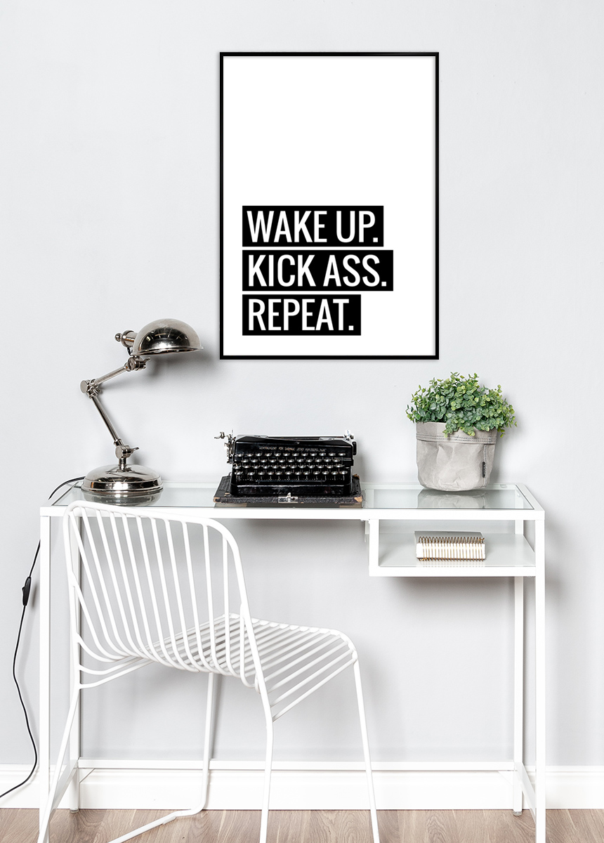 Byť každý deň úplne skvelý neprichádza vždy prirodzene. To nie je nič, za čo by ste sa mali hanbiť! Povzbuďte sa radšej k tomu, aby ste boli, tým že si na stenu zavesíte tento vyzývavý plagát. Plagát má štýlový a jednoduchý dizajn s bielym pozadím a čiernym a bielym tlačou s textom „Wake up. Kick ass. Repeat.” K dispozícii v 6 rôznych formátoch a cenových kategóriách. Dopĺňte ho čiernym alebo farebným rámom z nášho širokého sortimentu.