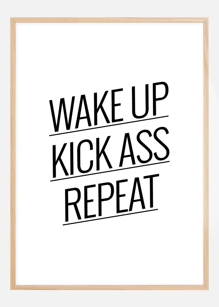 Každý môže občas potrebovať trochu povzbudenia v každodennom živote. Vložte tento krásny plagát na stenu, aby ste ho videli ako prvú vec ráno, keď vstanete. Plagát je biely s mierne skloneným, retro inšpirovaným textom, ktorý znie ”Wake up, Kick ass, Repeat.” Čierno-biely dizajn sa pekne kombinuje s farebným rámom z nášho veľkého sortimentu. Pretože plagát je dostupný v 6 rôznych veľkostiach, môžete si byť istí, že nájdete taký, ktorý bude presne vyhovovať vám.