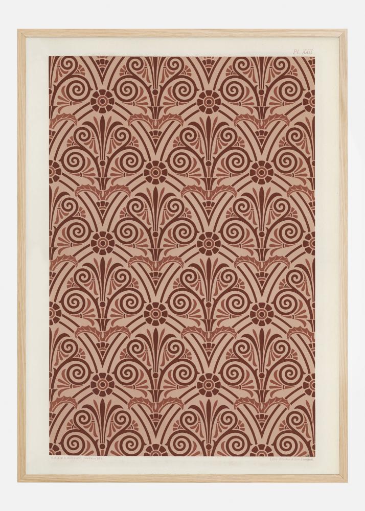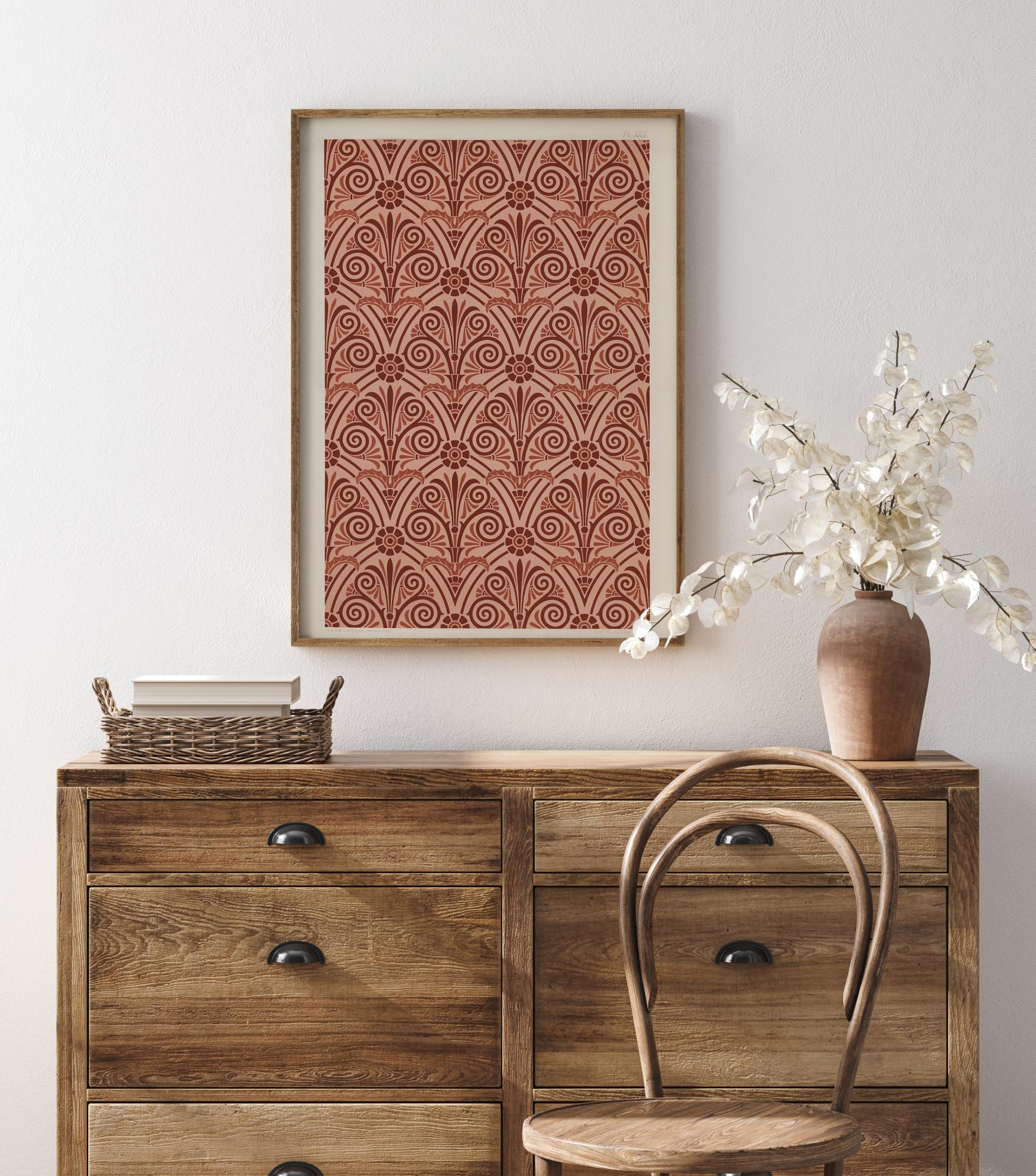 Svetlo vzorovaný plagát s červenými opakujúcimi sa vzormi. V rámci vzorov sú zvlnené kruhy, ktoré vyzerajú ako listy alebo strapce. Sú tam tiež kvetinové tvary v pravidelných intervaloch, čo robí z toho botanický tlačený vzor. Perfektné na tapetovanie, pozrite sa, aké obrazy vidíte v týchto zložitých vzoroch.