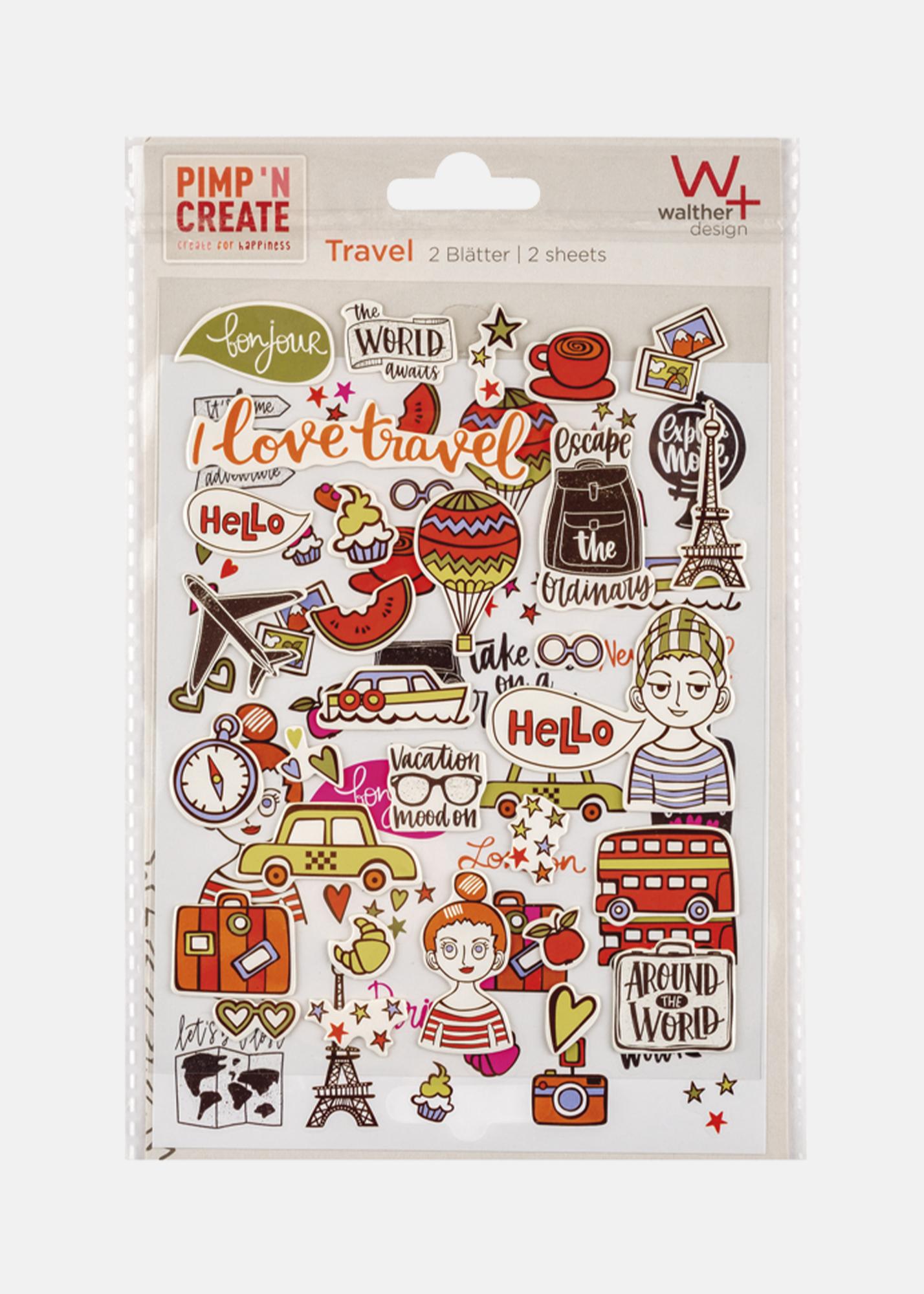 Samolepiace nálepky s cestovateľskou tematikou. Perfektné na kreatívny dizajn fotoalbumov, na ozdobenie darčekov alebo na vytvorenie blahoželaní. Balenie obsahuje 1 hárok 3D nálepiek a 1 hárok plochých nálepiek.