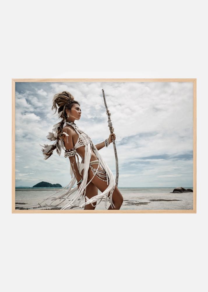 Plagát bojovníčky s mladou ženou pózujúcou na pláži oblečenou v svetlom kmeňovom odeve. Jej opálená pokožka kontrastuje s bielymi voľnými šatami a šperkami, ktoré pokrývajú jej telo a vinú sa cez jej vlasy. Jej silná póza dostáva extra váhu dlhým palicou, ktorú drží v ľavej ruke, keď sa pozerá na svojich nepriateľov.