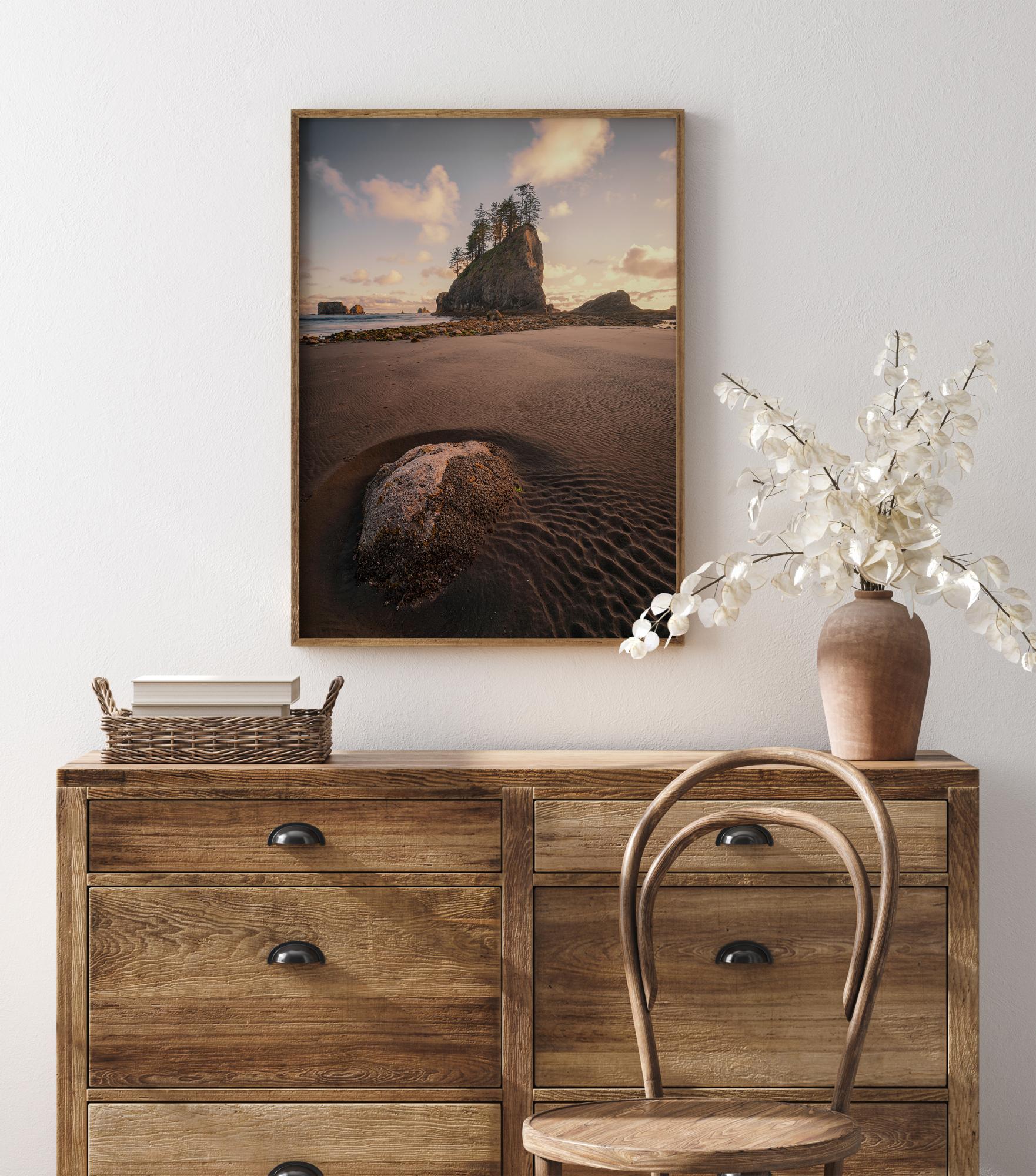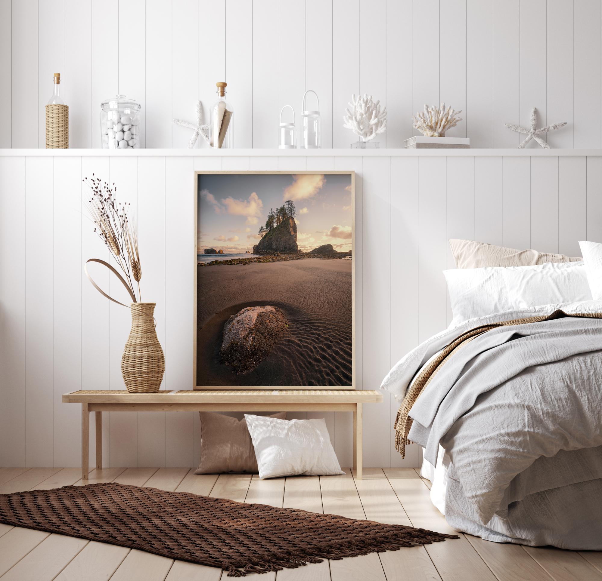 Malebná poster s detailným pohľadom na pláž. Nízky uhol vám umožní nahliadnuť blízko k piesku, kde môžete sledovať vodné stopy vytvorené z vodnej sústavy. V diaľke sa z mora týči stromami porastený útes smerom k jemne modrej oblohe plnej nadýchaných bielych oblakov.