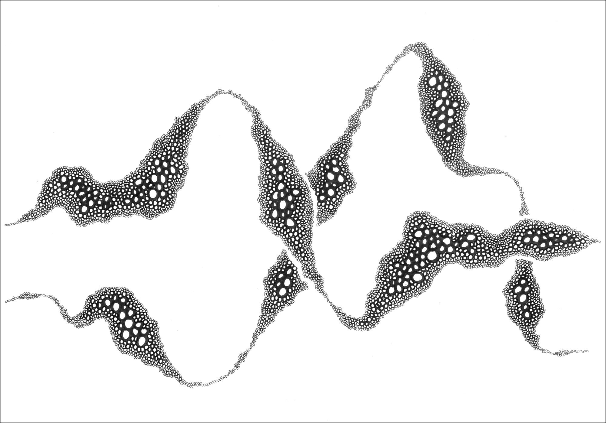 Dramatický abstraktný plagát s rôznymi čiernymi a bielymi kruhmi, ktoré vytvárajú zvláštne vlniace sa vlny na bielom pozadí. Sú tam veľké a malé kruhy ako bubliny, ktoré sú pripevnené na dlhých, vlniacich sa vláknach, ktoré sa krútia a kývajú ponad obraz a krížia sa navzájom v tomto zvláštne fascinujúcom diele.