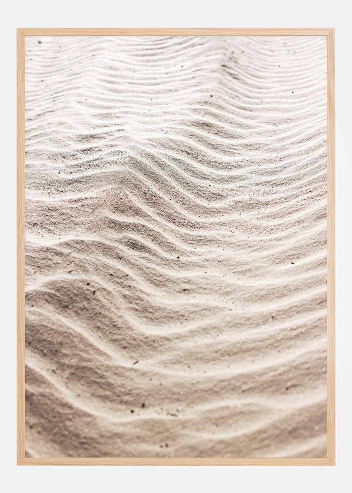Vzorovaný plagát so záberom zblízka na zvlnenie piesku. Obdivujte, ako vietor vytvára jemné vlny v piesku, keď sa tieto zvlnenia posúvajú smerom k bielemu svetlu na plagáte. Nechajte sa uniesť touto piesočnatou scénou.