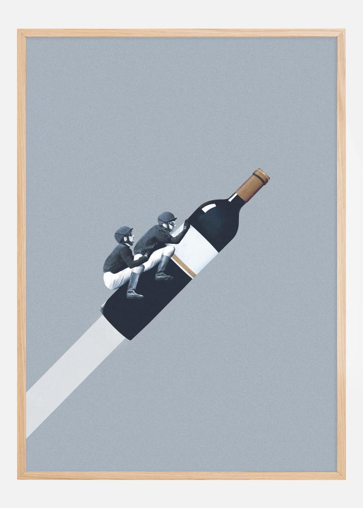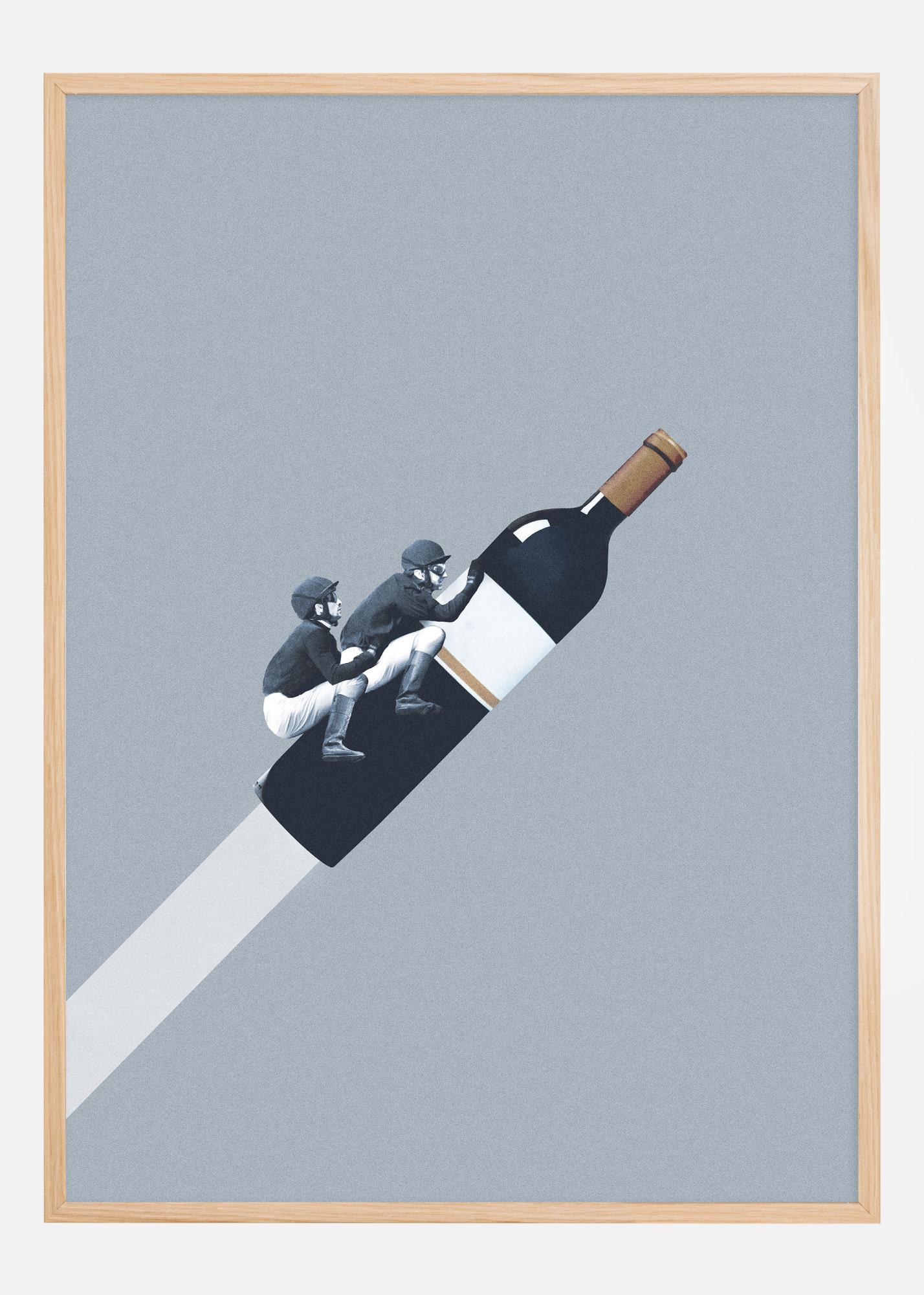 Tento jedinečný a podnetný plagát zachytáva fantazijnú scénu, kde dvaja ľudia v klasických jazdeckých úboroch triumfálne jazdia na naklonenej fľaši vína. Scéna je dielom kreatívnej fantázie, ktorá spája tradičné s absurdným a predstavuje pocit dobrodružstva a úniku. Ukazuje, ako dvaja jazdci dokážu zvládať vlny bežného života s rovnakou ladnou kontrolou, ako keby jazdili vlnitým krajom.