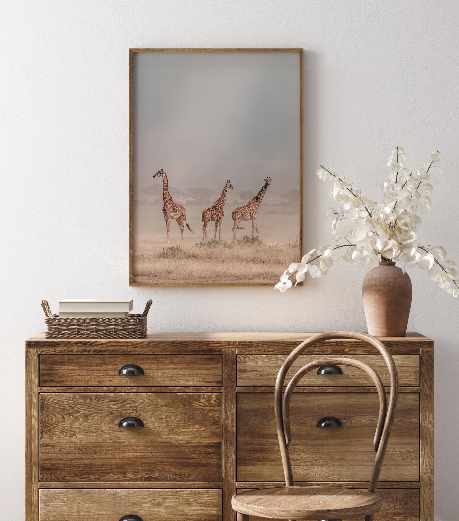 Krásny výraz divočiny s tromi žirafami na africkej savane. Žirafy sa pozerajú rôznymi smermi, zatiaľ čo bojujú proti prachu vetra v Amboseli, ktorý sa točí do špirál a vytvára hmlistý efekt. Navštívte Afriku bez opustenia domu s týmto emotívnym plagátom.