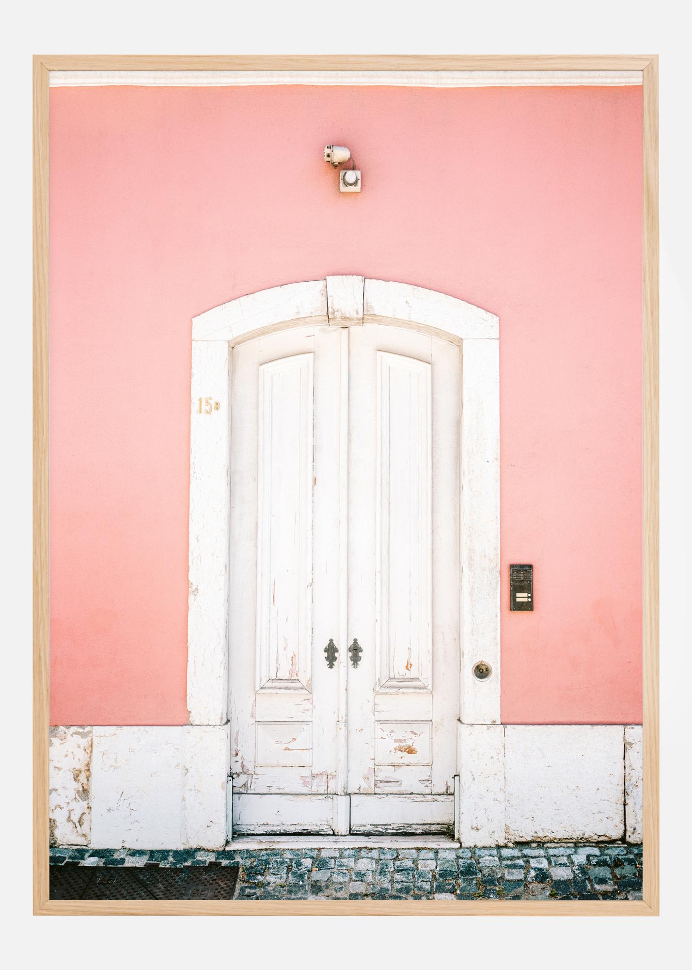 Tento plagát predstavuje krásny obraz bielych dverí proti jemnej ružovej stene, pohľad, ktorý dýcha uvoľneným a pritom elegantným štýlom, ktorý je tak typický pre Lisabon. Biela natretá plocha dverí, ktorá vykazuje známky patiny a veku, dodáva pocit histórie a charakteru, zatiaľ čo čierne železné detaily dodávajú klasický nádych. Číslo domu "15" je nenápadne umiestnené vľavo od dverí a vydláždený chodník zosilňuje čaro európskej mestskej krajiny.