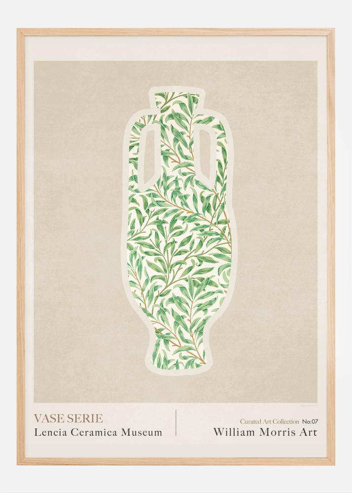 Tento delikátny a prírodou inšpirovaný plagát je číslo 07 v našej "Curated Art Collection" z Lencia Ceramica Museum, ktorý oslavuje umelecké dedičstvo Williama Morrisa. Zobrazuje siluetu klasickej vázy, naplnenú jedným z Morrisových výrazných zelených rastlinných vzorov, čo ukazuje jeho majstrovský spôsob kombinovania formy a funkcie s estetickou krásou v dizajne. Je to nadčasová pocta Morrisovej vízii a jeho schopnosti čerpať inšpiráciu z prírody a premieňať ju na umenie.