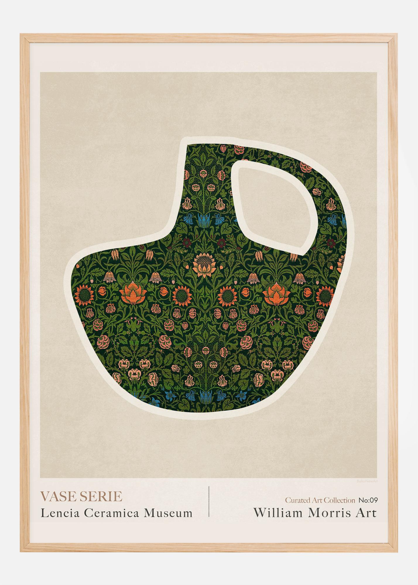 Farebnosť plagátu je hlboká a teplá, s tónmi zelenej, oranžovej a ružovej, ktoré vytvárajú bohatú a komplexnú paletu. Táto sofistikovaná farebná kompozícia krásne kontrastuje s neutrálnym pozadím a vyniká v jednoduchej a čistej drevenej ráme (nie je zahrnutá v motíve). Ako číslo 09 v sérii váz Múzea Lencia Ceramica, tento plagát je poctou umeleckému majstrovstvu Williama Morrisa a ponúka elegantnú a historicky prepojenú dekoráciu pre všetkých, ktorí oceňujú veľkosť dizajnu a krásu prírodných motívov.