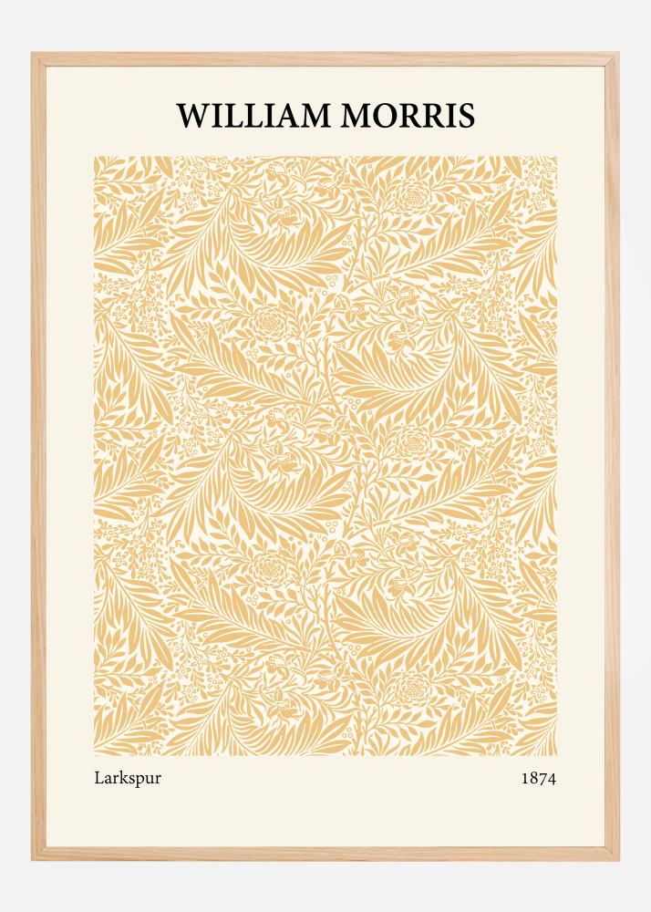 Svojím teplým, jednoliatym zlatým tónom, táto plagátová reprodukcia obnovuje prepychový dizajn "Larkspur" od Williama Morrisa z roku 1874. Bohatá kompozícia listov a kvetov tancuje po papieri, čo ilustruje zručnosť a precíznosť, za ktoré je Morris známy v hnutí Umenie a remeslá. Tento plagát prináša pocit tepla a slnečného svitu do každej miestnosti a je nádhernou poctou viktoriánskej ére umeleckého remesla.