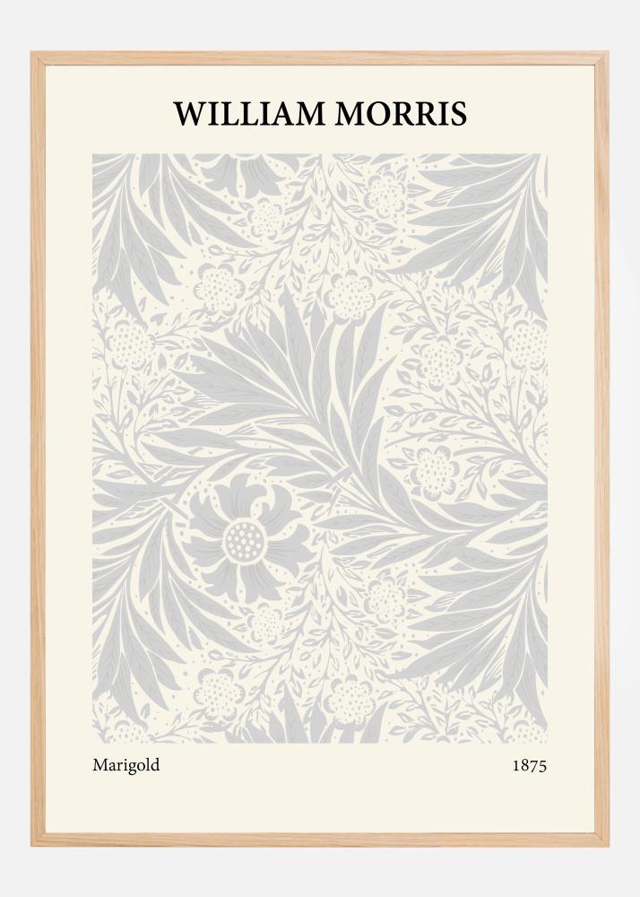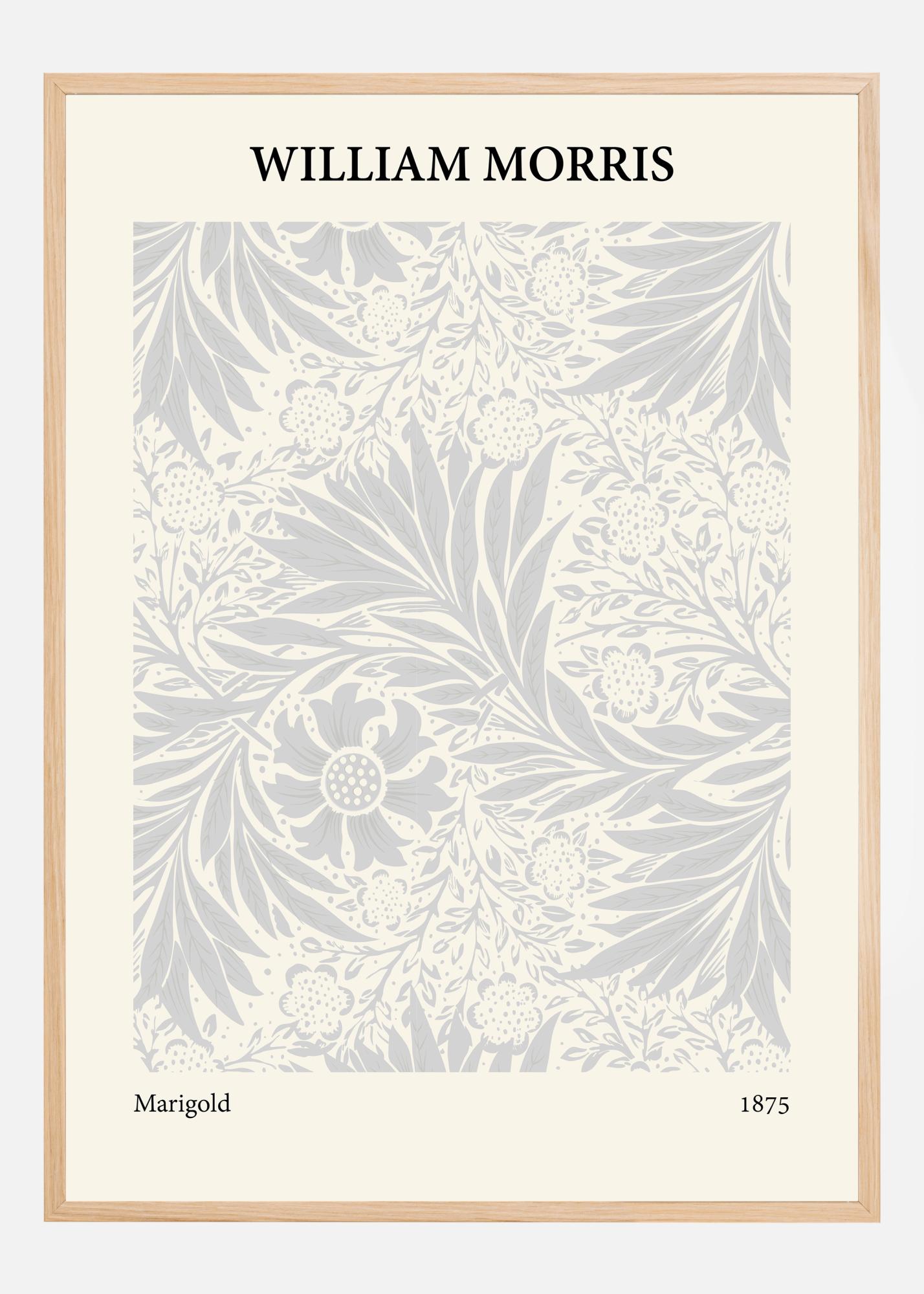 Táto plagát je elegantné zobrazenie diela Williama Morrisa "Marigold" z roku 1875, a vyvoláva pocit pokoja a prírodnej krásy. Dizajn je plný kvitnúcich nechtíkov a jemného lístia, starostlivo umiestneného v symetrickom a príťažlivom vzore. Jemná farebná kombinácia bledých sivých a bielych tónov vytvára mäkkú a prívetivú estetiku, ktorá je charakteristická pre Morrisovu prácu.