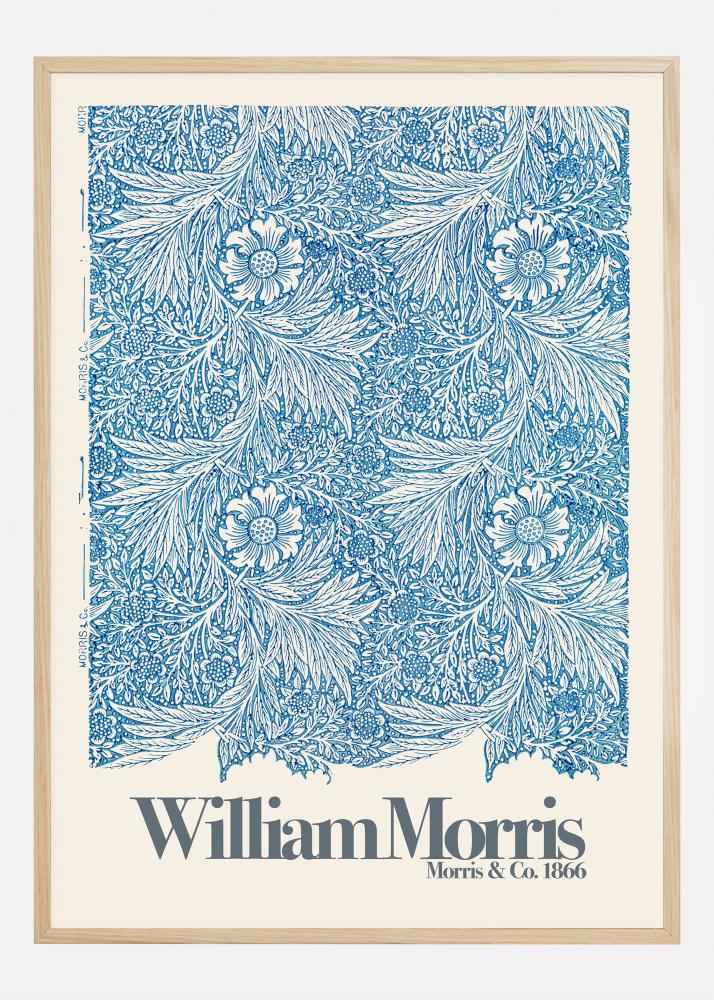 Tento plagát zobrazuje klasický vzor Williama Morrisa s názvom "Marigold", vytvorený spoločnosťou Morris & Co. okolo roku 1866. Tento ikonický vzor, známy pre svoje zložité a prírodou inšpirované prvky, je vyrobený v tmavomodrej farbe na čistej, krémovej pozadí. Každý detail kvetinového usporiadania je starostlivo vypracovaný, čo ukazuje Morrisov pocit pre krásu v prírode a schopnosť premeniť ju na umelecké diela, ktoré sú nadčasové a obľubované aj dnes.