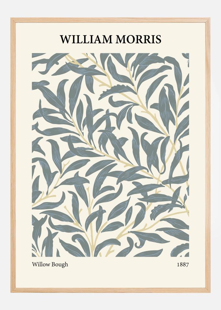 Tento umelecký plagát vzdáva poctu Williamovi Morrisovi a jeho nadčasovému vzoru "Willow Bough" z roku 1887. Živá a dynamická kompozícia vŕbových listov na krémovom pozadí je klasickou reprezentáciou Morrisovej lásky k prírode a jeho zručnosti vytvárať detailné textilné vzory. Pokojná a chladná farebná paleta modrej a zelenej vytvára pocit pokoja a ticha, čo robí tento dizajn milovanou klasikou.