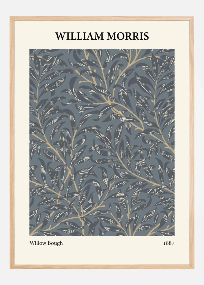 Ide o nápadný plagát, ktorý zvýrazňuje klasický motív "Willow Bough" od Williama Morrisa z roku 1887. Prepracované vŕbové listy sú zručne vyobrazené v odtieňoch modrej a sivej, ktoré sú elegantne kontrastované s líniami v teplej zlatej farbe. Táto kombinácia dodáva celkovému dizajnu bohatstvo a hĺbku a je dôkazom Morrisovho majstrovstva a jeho trvalého vplyvu v oblasti dizajnu vzorov.