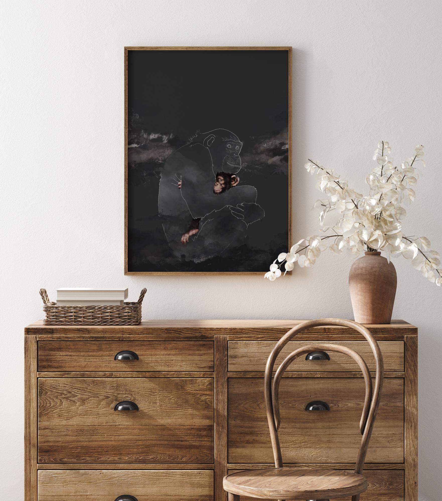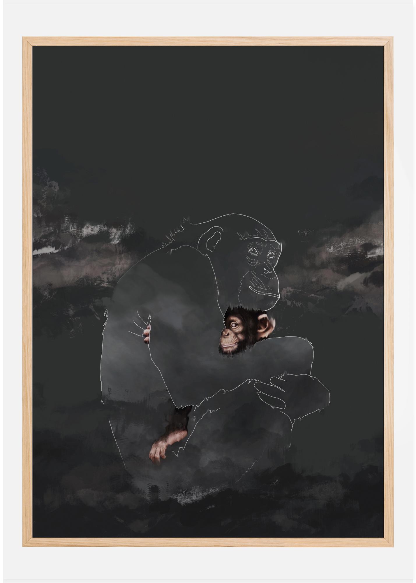 Emocionálny plagát so šimpanzím mláďaťom, ktoré objíma chýbajúci obraz svojej matky. Toto je dojímavý obraz, keď šimpanzoidné dieťa objíma nič iné než obrysy svojej matky, ktorá sedí na mäkkých oblakoch na čiernej oblohe.