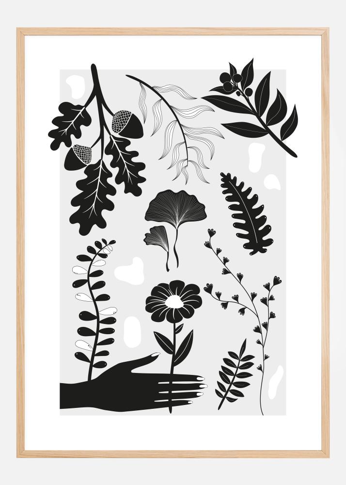 Odvážny plagát s čiernobielymi figúrami rôznych listov, rastlín a kvetov. Čierna ruka sa načahuje, aby uchopila jeden zo štylizovaných kvetov. Žaluďe, kvety, paprade a ďalšie plnia tento jednoduchý, ale zaujímavý plát. Vdýchnite svojmu domovu botanickú náladu, keď zavesíte tento plagát s rastlinami.