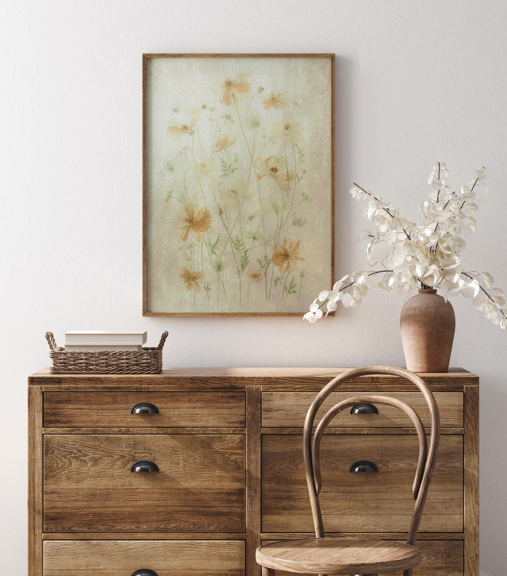 Elegantný plagát s jemnými oranžovými kvetmi a zelenými listami na bielom pozadí. Akvarelový efekt spôsobuje, že každá z týchto rastlín vyzerá jemne a krehko. Napriek tomu je v každej z nich v tejto jemnej, kvetinovej snímke úžasný detail. Premeňte svoj domov na rajskú záhradu, keď si domov prinesiete tento kvetinový obraz.