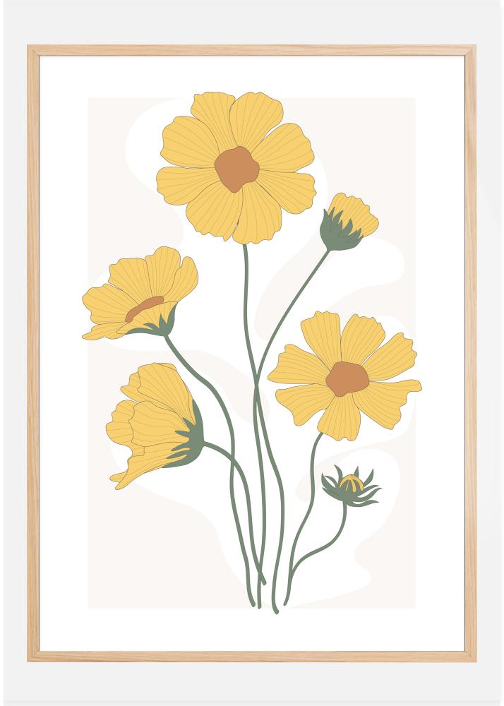 Svetlý plagát so žltými nechtíkmi vytvorený v zábavnom štýle tlače. Každý z kvetov žiari na bielom pozadí. Napriek tomu, že ide o jednoduchý štylizovaný dizajn, kvety sú veselé a dokonalý spôsob, ako sa zobudiť s úsmevom na perách.
