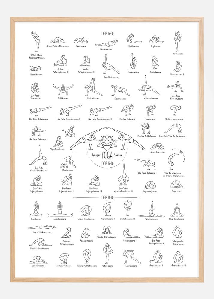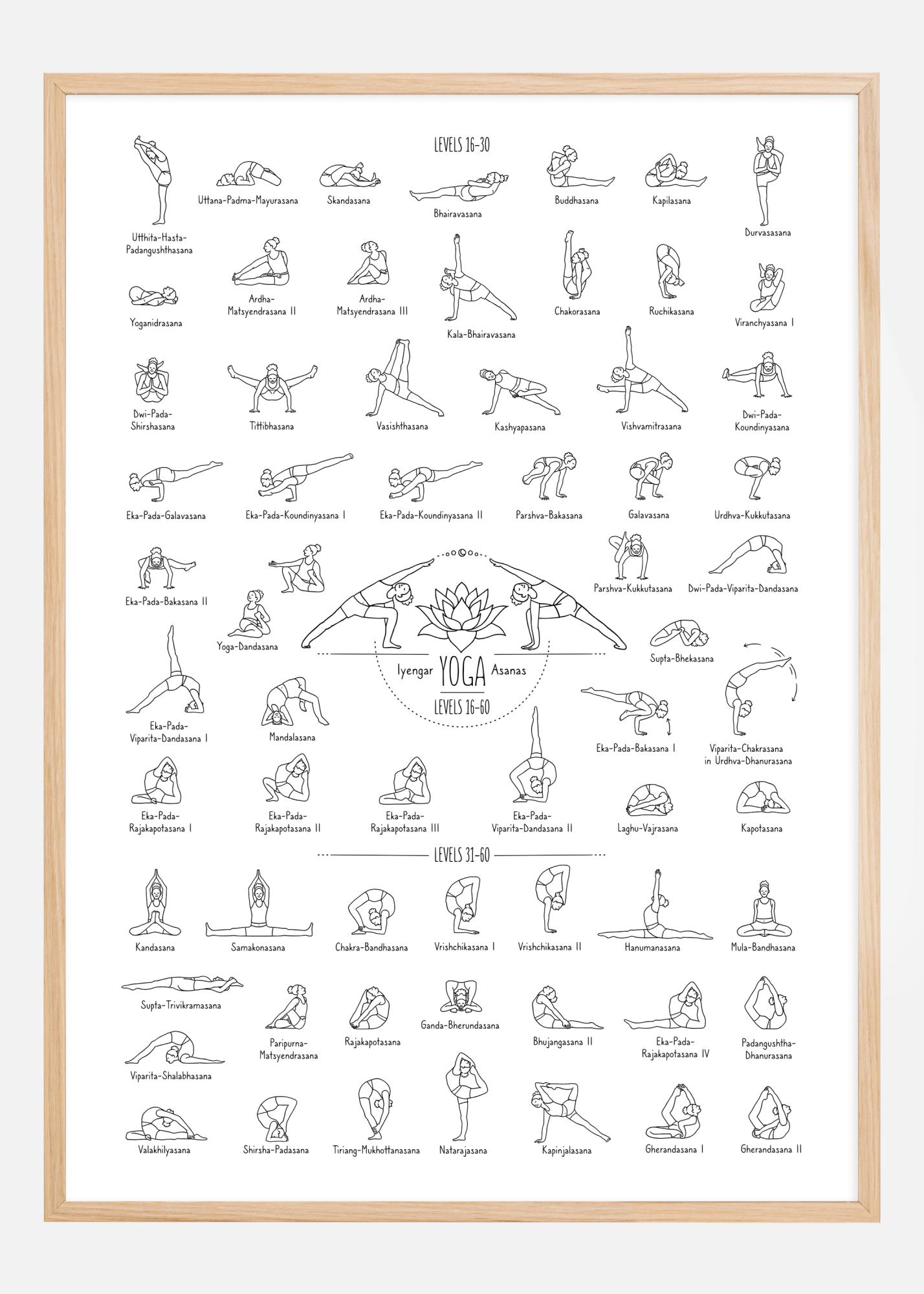 V strede a v popredí plagátu je názov 'Iyengar YOGA Ásany' a úrovne náročnosti, čo naznačuje, že tieto cvičenia pochádzajú zo špecifickej formy jogy vyvinutej B.K.S. Iyengarom. Tento vzdelávací plagát je ideálny pre nadšencov jogy, ktorí chcú prehĺbiť svoju prax, ako aj pre inštruktorov, ktorí potrebujú vizuálnu referenciu vo svojich štúdiách. Jeho čistý a jednoduchý dizajn z neho robí elegantnú a funkčnú dekoráciu, pričom prispieva k inšpiratívnej a poučnej atmosfére v miestnosti.