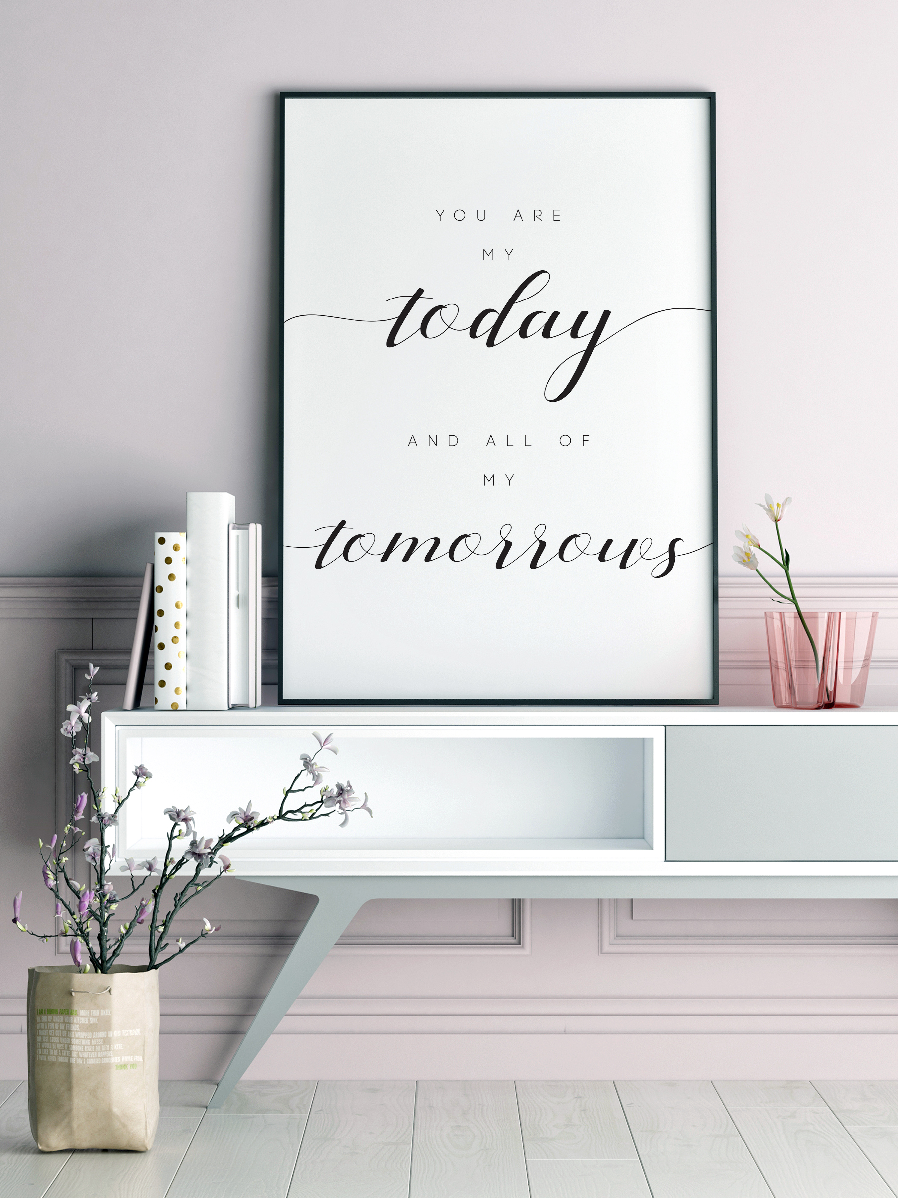 Motivačný plagát so silným citátom, ktorý vás má inšpirovať každý deň. You Are My Today and All of My Tomorrows je dokonalým darčekom pre milovanú osobu, aby ste jej ukázali, ako si ju vážite. Umiestnite ho na miesto, kde ho môžu vidieť každé ráno.