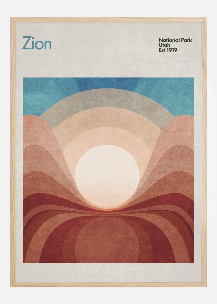 Tento plagát zachytáva veľkolepú prírodu Zion National Park so štýlizovanými vrstvami krajiny, ktoré vytvárajú abstraktnu interpretáciu ikonických skalných útvarov parku a rozľahlých výhľadov. Text "Zion National Park Utah Est 1919" poskytuje historický kontext a vzdáva hold dedičstvu parku ako národného pokladu už od začiatku 20. storočia.